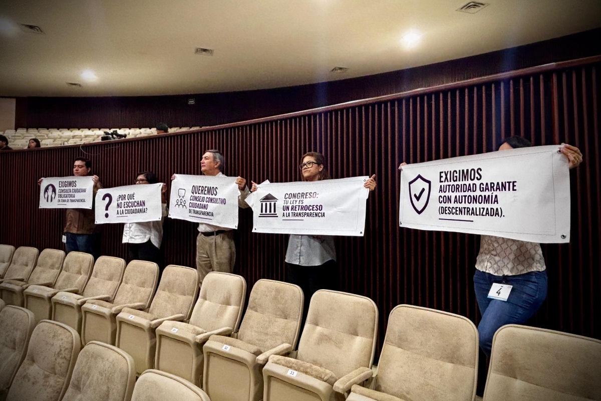 Mientras la iniciativa avanzaba en el Congreso, integrantes del Comité de Participación Ciudadana (CPC) se manifestaron de forma silenciosa dentro del recinto. Con lonas, lanzaron cuestionamientos y exigencias: “¿Por qué no escuchan a la ciudadanía?”, “Queremos Consejo Consultivo Ciudadano de Transparencia”, “Congreso: tu ley es un retroceso” y “Exigimos autoridad garante con autonomía”.