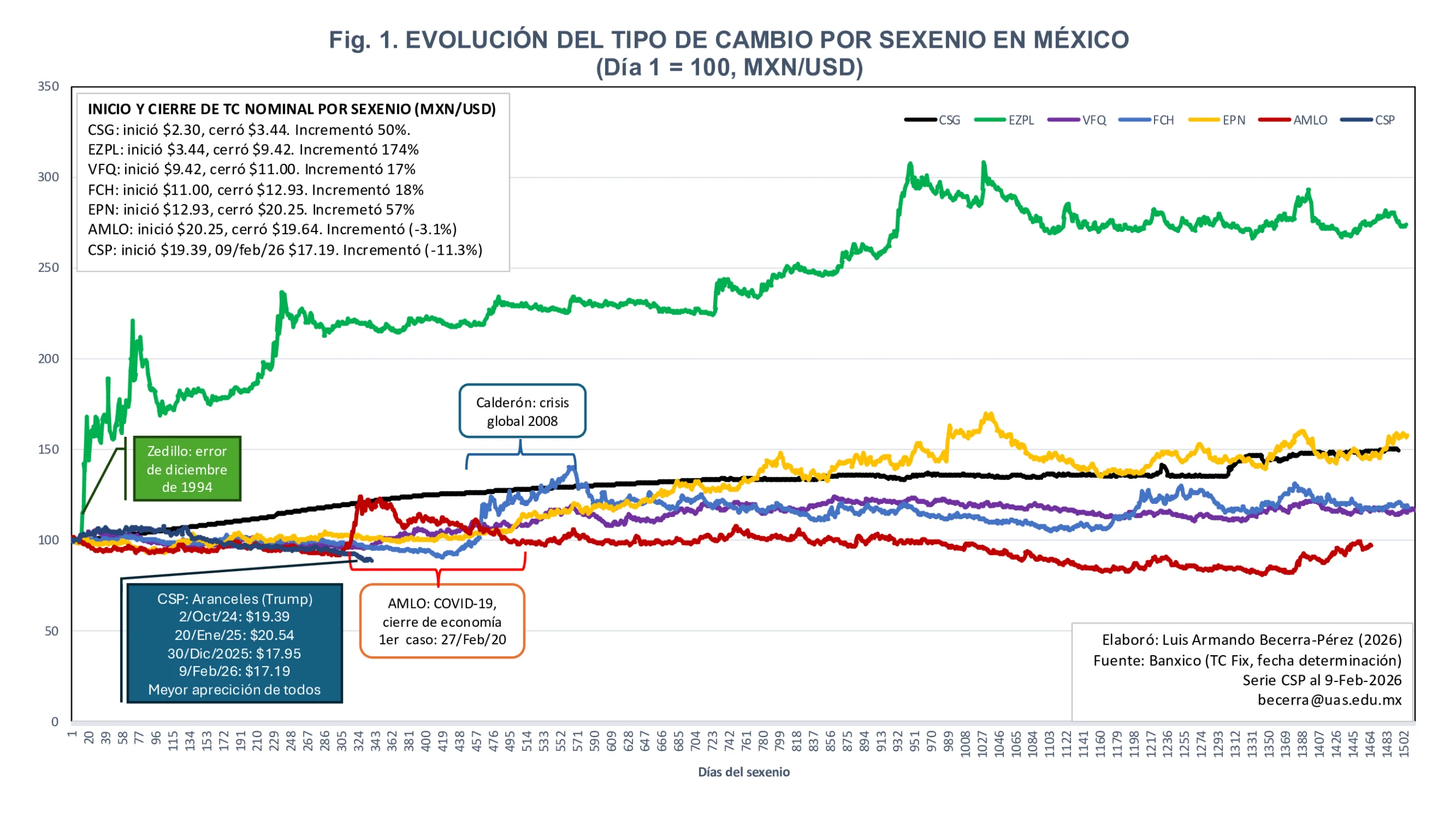 Observando únicamente el incremento del tipo de cambio nominal del día de inicio y de cierre de cada sexenio, tenemos: Salinas 50%, Zedillo 174%, Fox 17%, Calderón 18%, Peña Nieto 57%, AMLO menos 3.1% (decremento), Sheinbaum (9/feb/26) menos 11.3% (decremento).