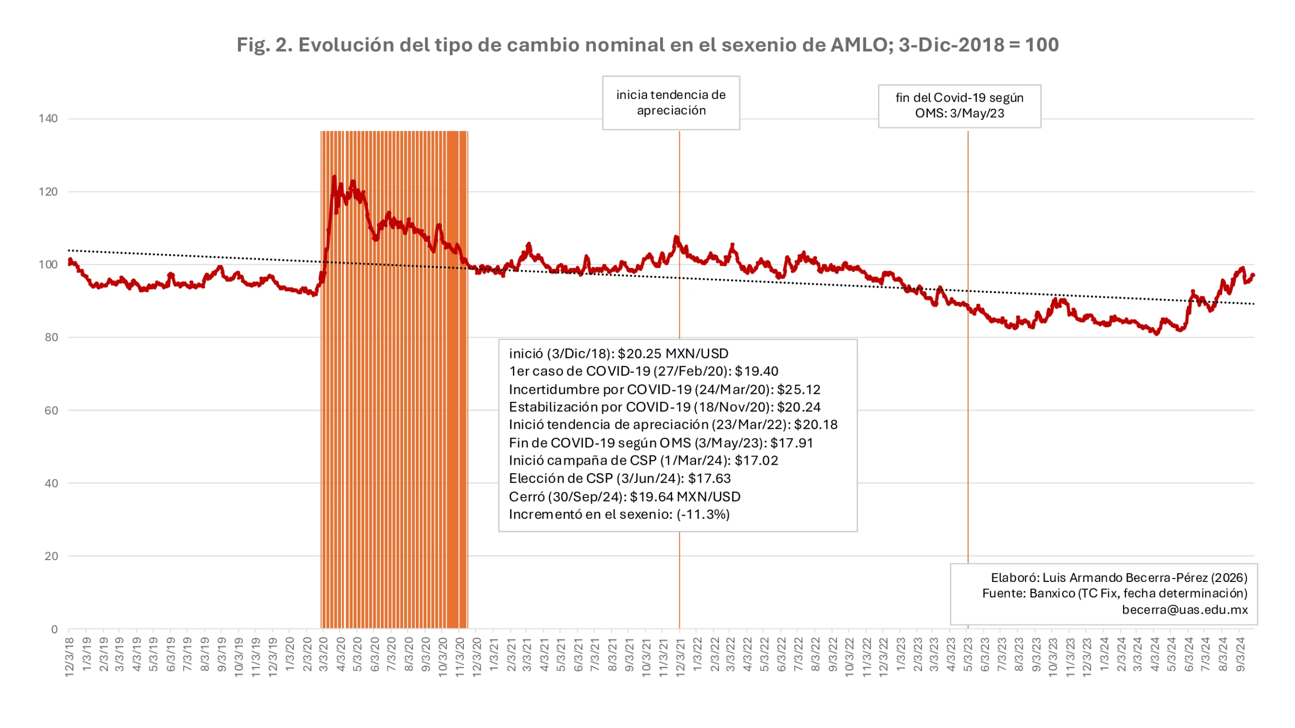 Para un análisis más detallado, la figura 2 muestra únicamente el índice del sexenio de AMLO. Se observa que después de pasada la pandemia, la cual provocó una gran incertidumbre la cual en su pico más alto llevó al tipo de cambio a $25.12 MXN/USD (24/mar/2020), a finales del año 2020 se estabilizó alrededor de $20 MXN/UDS, e inició una tendencia a la apreciación en el primer trimestre del 2022. AMLO terminó su sexenio con tipo de cambio nominal de $19.64 MXN/USD, un nivel evidentemente apreciado del peso mexicano.
