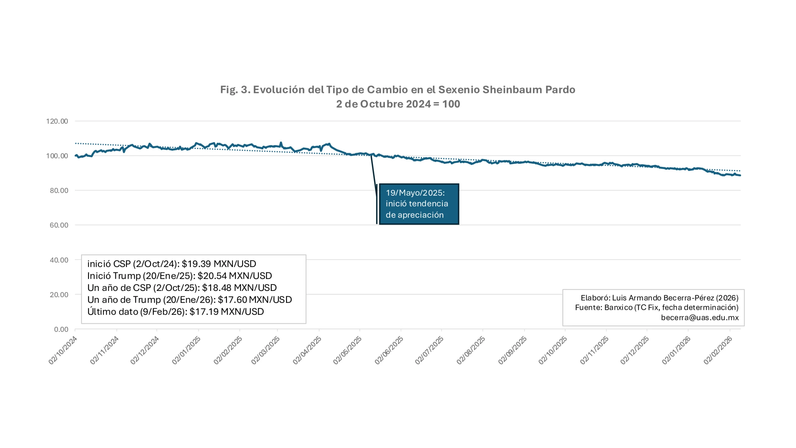 La figura 3 muestra la evolución del tipo de cambio en lo que va del sexenio de la presidenta Claudia Sheinbaum Pardo. Los datos indican un tipo de cambio apreciado, con un punto de inflexión hacia la apreciación a partir del 19 de mayo de 2025. Ella tomó el gobierno con un tipo de cambio de $19.63 MXN/USD (2/oct/2024) y al cierre de este análisis (9/feb/2026) se ubica en $17.19 MXN/USD, una disminución de más del 11%.