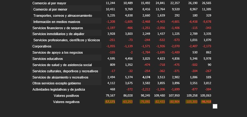 · El sector agrícola va en decadencia, lo mismo que el de la construcción y el referente al de los alojamientos. Prueba de que la agricultura y el turismo está prendido con alfileres, y que el de la construcción es coyuntural. O bien, que los factores internos no son determinantes estructurales de la economía estatal;