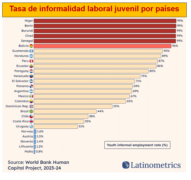 Con el 67 por ciento de sus jóvenes en la informalidad, Latinometrics ubica a México en el lugar 11 en el conjunto de los países de América Latina. Destaca en su análisis que en ningún otro lugar de la región la informalidad es un problema tan grave para los jóvenes como en Bolivia. En este país, menos del 5 por ciento de los trabajadores jóvenes cotizan a la economía formal. Esto implica menos ingresos fiscales para el Estado, pero también una falta de protección para estos jóvenes adultos: no tienen días de baja por enfermedad ni prestaciones de compensación laboral si se lesionan en el trabajo. Señala también, que el problema de informalidad es tan grave en América Latina, que incluso Uruguay, el país con mejor desempeño en América Latina, tiene 20 veces más trabajadores jóvenes fuera de la formalidad que el peor país de Europa.
