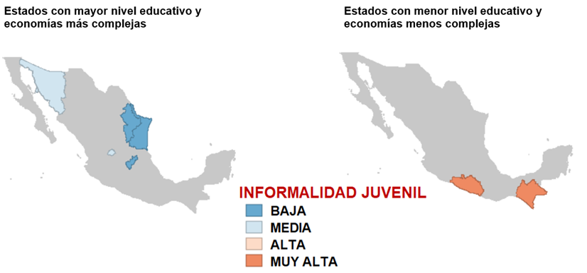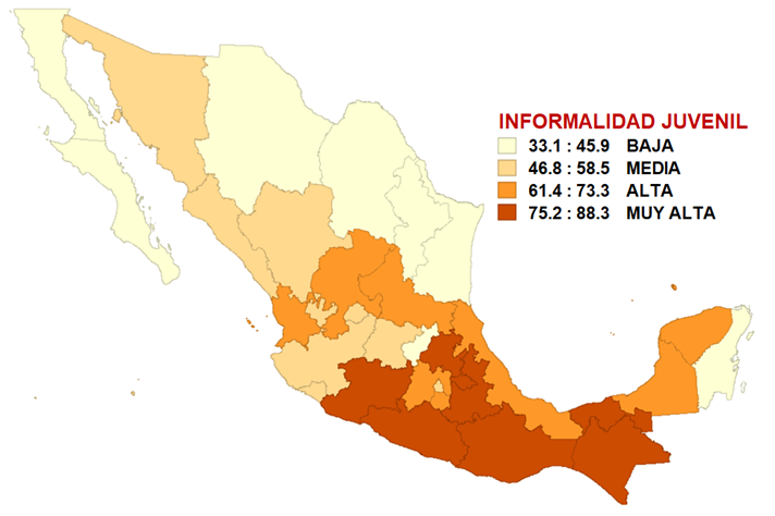 Hay entidades federativas en las que casi todos (ocho y nueve de cada 10) los jóvenes tienen un trabajo informal. Son los casos de Oaxaca (88.3%), Chiapas (84.7%), Guerrero (83.7%) y Puebla (77.0%). Cifras muy cercanas a las que existen en Bolivia y Guatemala. El porcentaje es muy alto también en Michoacán (76.8%), Tlaxcala (76.3%), Hidalgo (75.8%), Tabasco (75.2%) y Veracruz (73.3%). Los porcentajes más bajos se observan en Coahuila (33.1%), Nuevo León (35.0%) y Baja California (39.6%). Cifras que se asemejan a las de Uruguay y Costa Rica, en América Latina.