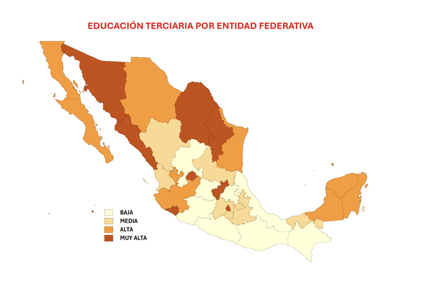 De acuerdo con el INEGI, en México el 17% de la población mayor de 24 años tiene estudios correspondientes a la llamada educación terciaria. El 14% cuenta con estudios de licenciatura y el 1.7% con estudios de posgrado. Los estados con los porcentajes más altos de población con educación terciaria completada son la Ciudad de México (29.3%), Querétaro (21.7%), Sinaloa (21.3%), Nuevo León (20.9%) y Colima (19.4%). Los porcentajes más bajos corresponden a Chiapas (9.6%), Oaxaca (10.6%) y Guerrero (11.6%).