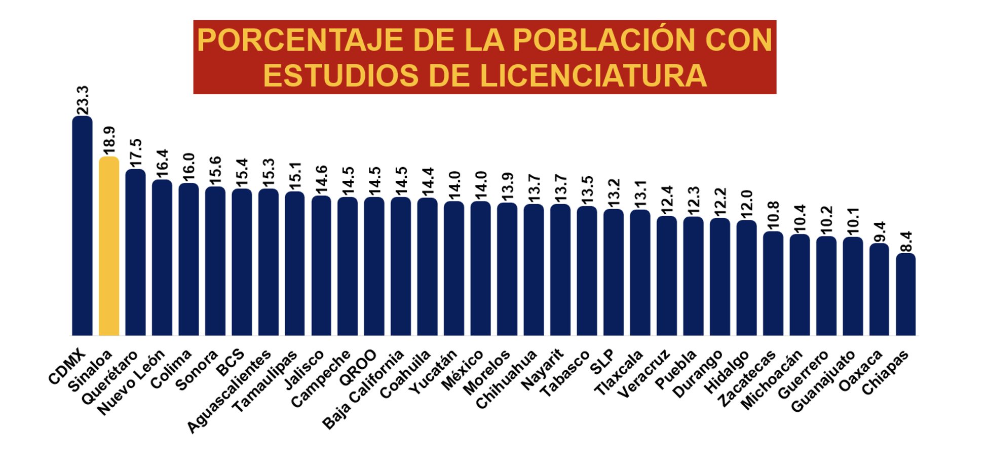Coahuila (2.2%), Nuevo León (2.1%) y la CDMX (1.9%), son los estados en donde un mayor porcentaje de su población cuenta con carreras técnicas; la CDMX (23.3%), Sinaloa (18.9%) y Querétaro (17.5%) en donde un mayor porcentaje de su población tiene estudios de licenciatura y; la CDMX (4.1%), Querétaro (2.5%) y Nuevo León (2.3%) son las entidades en las que un mayor porcentaje de su población ha terminado un posgrado.