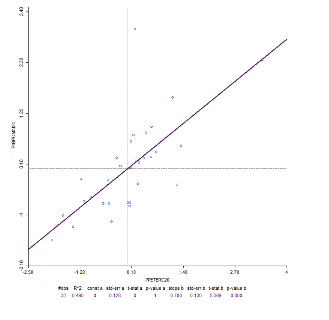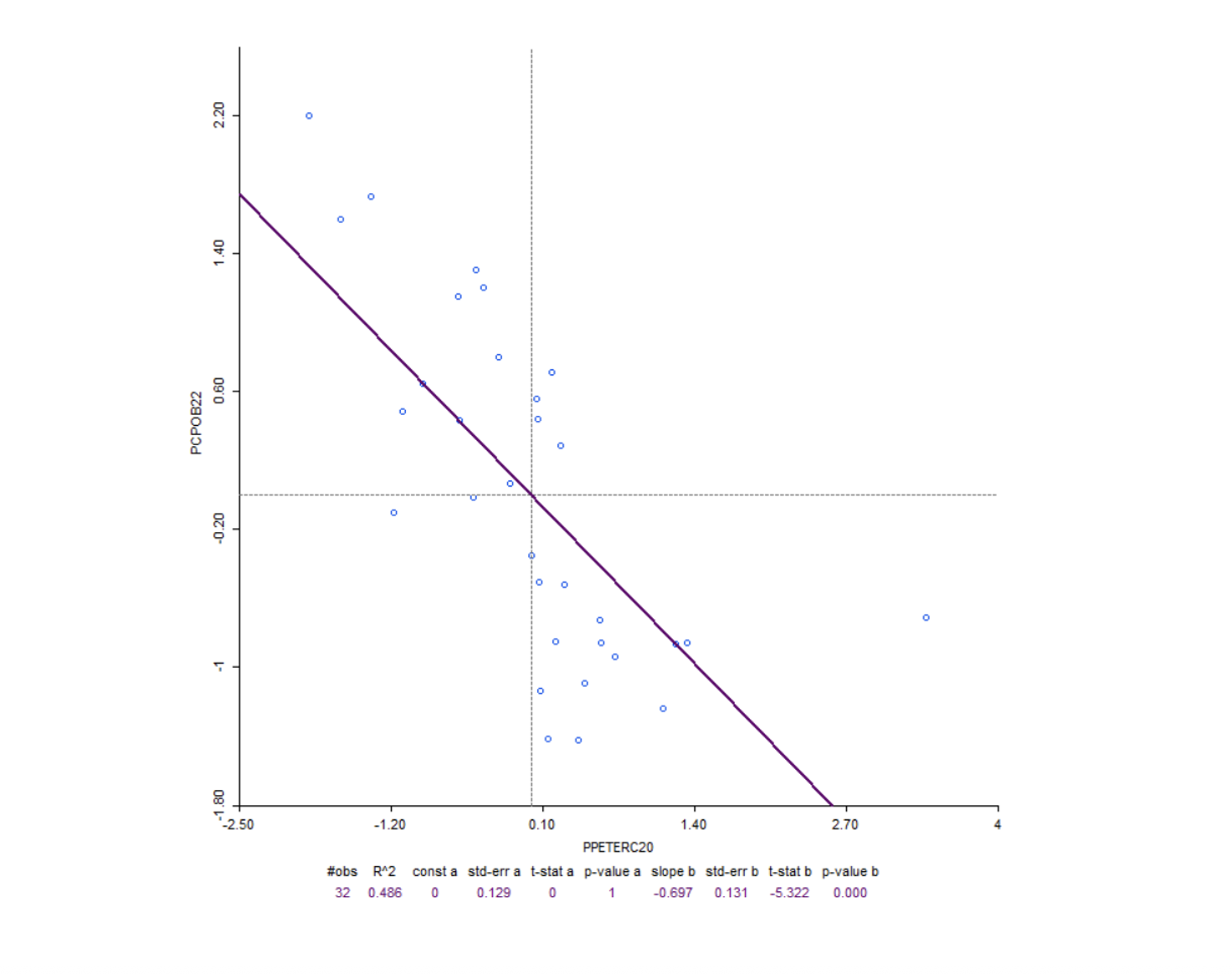 No puedo en este espacio proporcionar todos los detalles que derivan de estas relaciones por lo que para terminar me concentraré en la relación positiva del PPET con el PIB per cápita y la negativa con la pobreza.