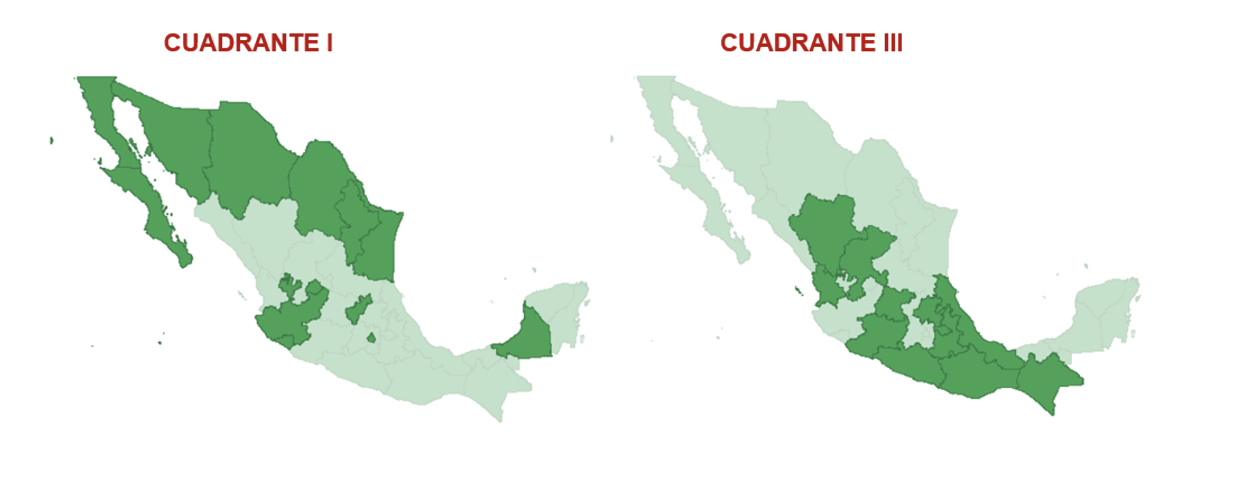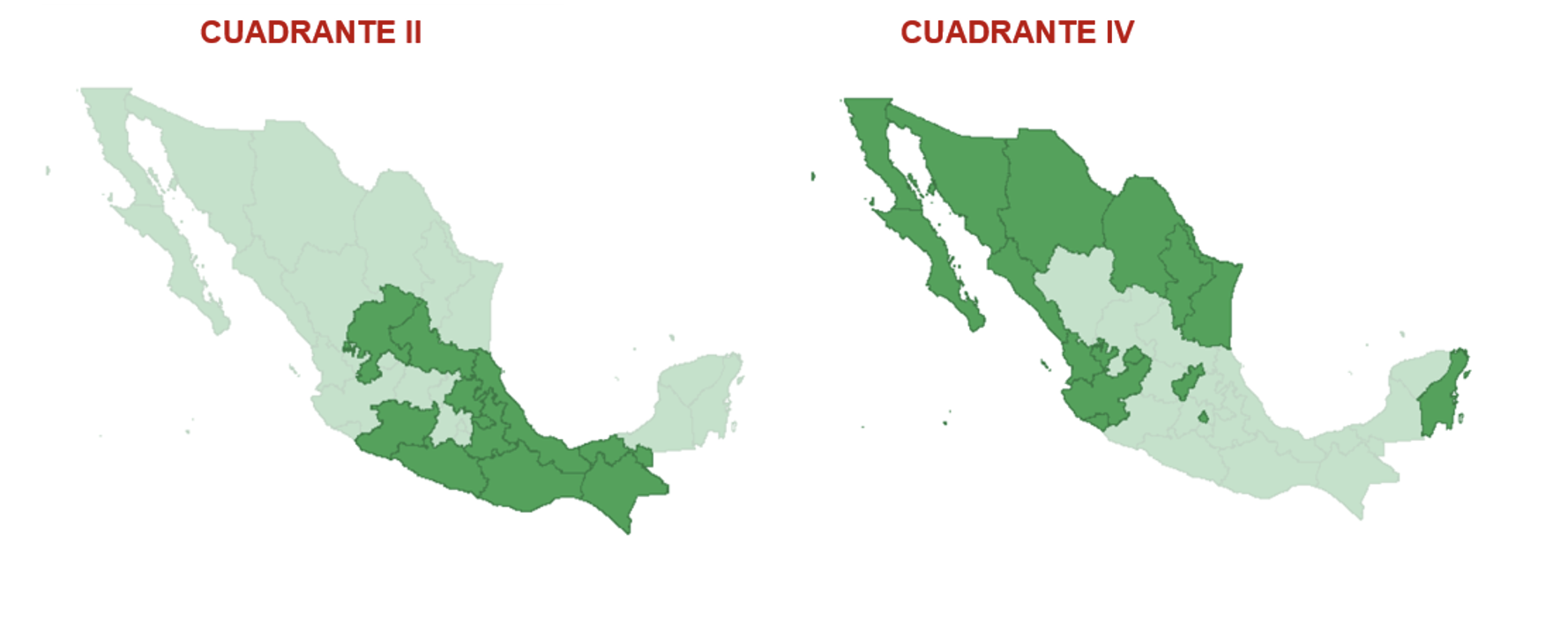 El mapa de dispersión entre el PPET (eje X) y el PIB per cápita (eje Y) pone en evidencia que se trata de una relación positiva y cada punto en el mapa corresponde a una entidad. El mapa se divide en cuadrantes en donde el I es el superior a la derecha ubicándose el resto de los cuadrantes en el sentido inverso a las manecillas del reloj. La mayor concentración de entidades se da en el I y III cuadrante, lo cual significa que, mayormente, los estados con un alto PPET tienen un PIB pc alto (cuadrante I) y los estados con un PPET bajo tienen un PIB pc bajo (cuadrante III). El gráfico espacio-temporal permite observar cuáles entidades federativas forman parte de cada grupo.