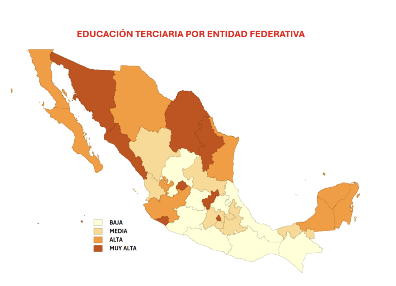 De acuerdo con el INEGI, en México el 17% de la población mayor de 24 años tiene estudios correspondientes a la llamada educación terciaria. El 14% cuenta con estudios de licenciatura y el 1.7% con estudios de posgrado. Los estados con los porcentajes más altos de población con educación terciaria completada son la Ciudad de México (29.3%), Querétaro (21.7%), Sinaloa (21.3%), Nuevo León (20.9%) y Colima (19.4%). Los porcentajes más bajos corresponden a Chiapas (9.6%), Oaxaca (10.6%) y Guerrero (11.6%).