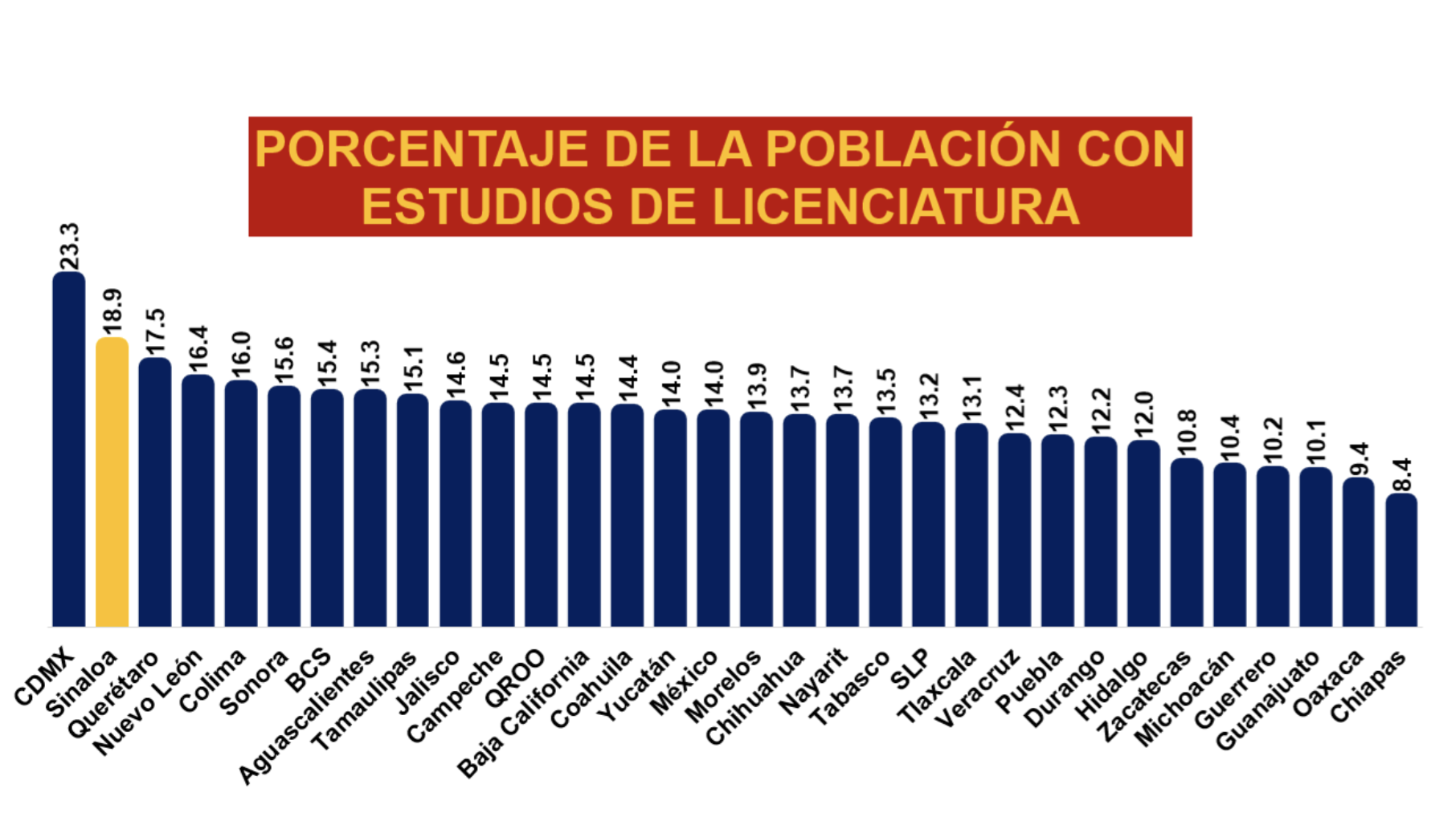 Coahuila (2.2%), Nuevo León (2.1%) y la CDMX (1.9%), son los estados en donde un mayor porcentaje de su población cuenta con carreras técnicas; la CDMX (23.3%), Sinaloa (18.9%) y Querétaro (17.5%) en donde un mayor porcentaje de su población tiene estudios de licenciatura y; la CDMX (4.1%), Querétaro (2.5%) y Nuevo León (2.3%) son las entidades en las que un mayor porcentaje de su población ha terminado un posgrado.