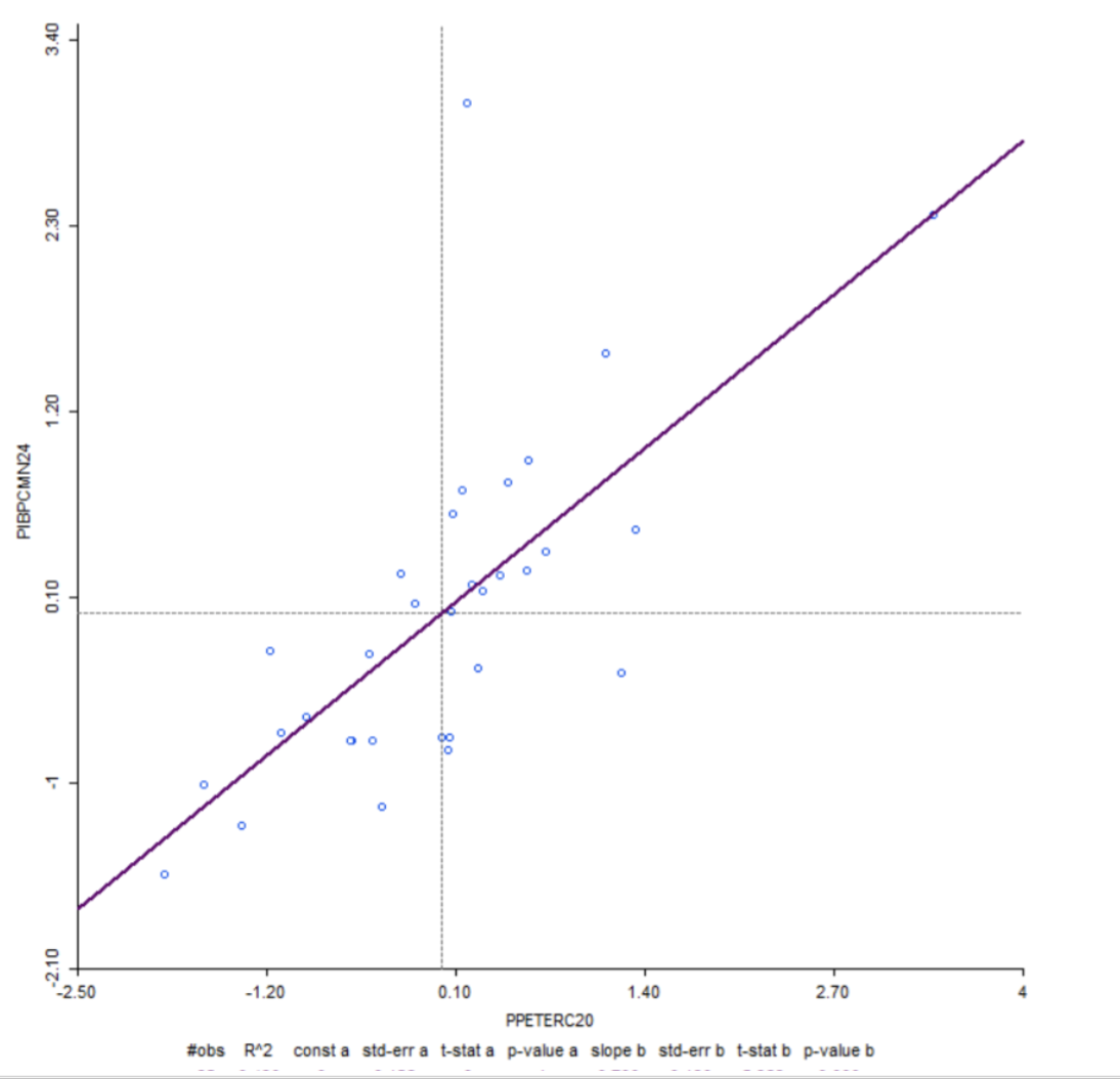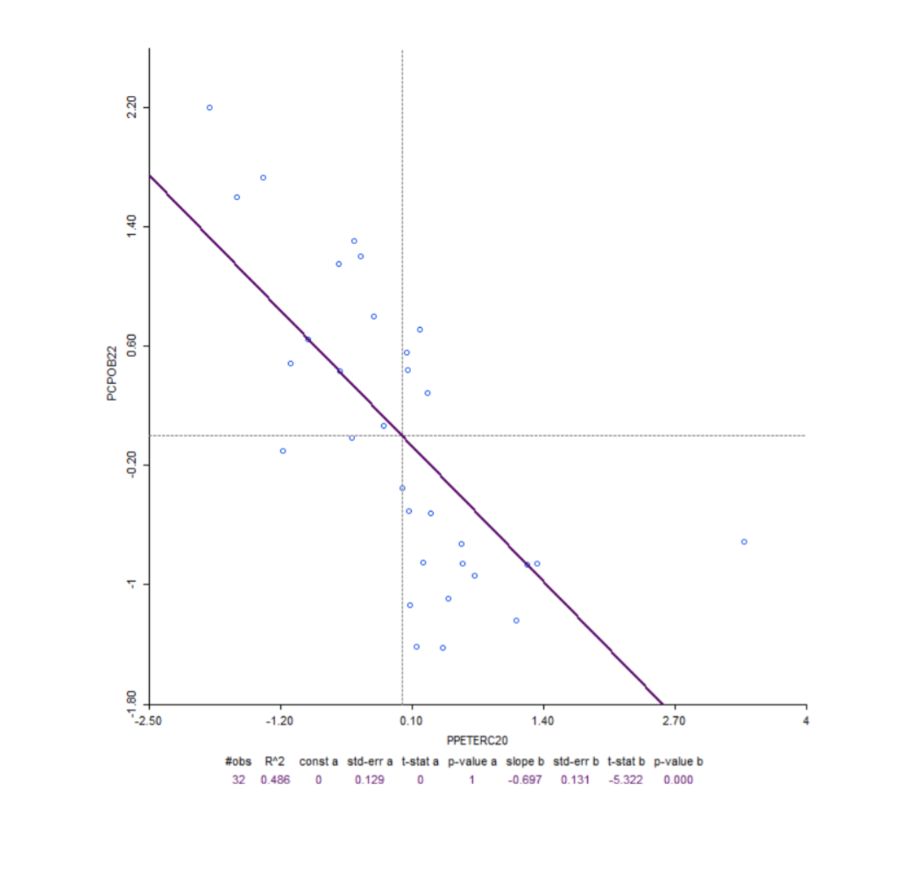 No puedo en este espacio proporcionar todos los detalles que derivan de estas relaciones por lo que para terminar me concentraré en la relación positiva del PPET con el PIB per cápita y la negativa con la pobreza.