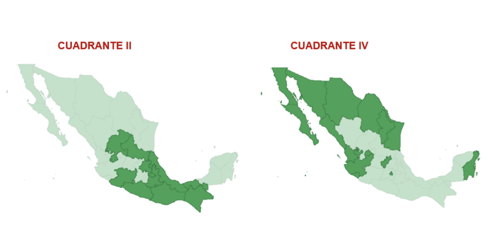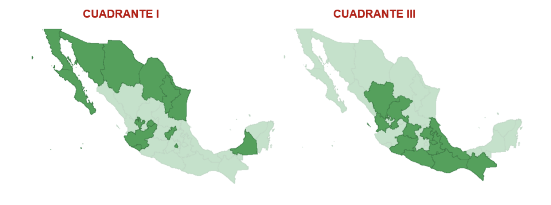 El mapa de dispersión entre el PPET (eje X) y el PIB per cápita (eje Y) pone en evidencia que se trata de una relación positiva y cada punto en el mapa corresponde a una entidad. El mapa se divide en cuadrantes en donde el I es el superior a la derecha ubicándose el resto de los cuadrantes en el sentido inverso a las manecillas del reloj. La mayor concentración de entidades se da en el I y III cuadrante, lo cual significa que, mayormente, los estados con un alto PPET tienen un PIB pc alto (cuadrante I) y los estados con un PPET bajo tienen un PIB pc bajo (cuadrante III). El gráfico espacio-temporal permite observar cuáles entidades federativas forman parte de cada grupo.