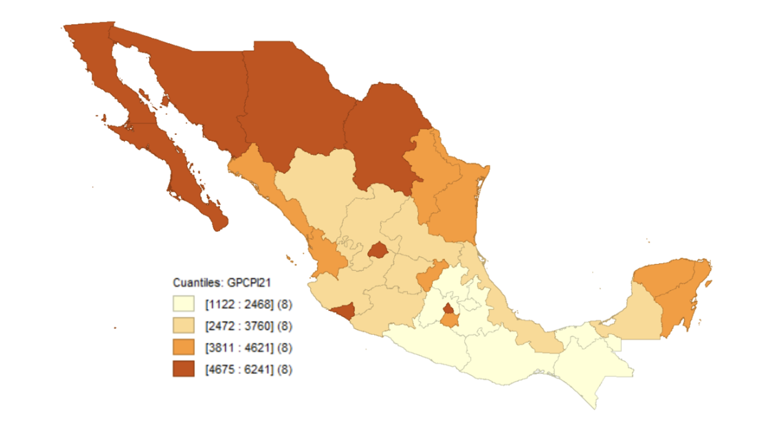 El mapa condicional (que se muestra abajo) representa la relación entre el PIB per cápita por entidad federativa y el porcentaje de la población en condición de pobreza extrema, teniendo como tema del mapa el GPI por entidad. Podemos observar que el mapa que se encuentra hasta la derecha y en la parte inferior, corresponde a estados con alto PIB por habitante y niveles bajos de pobreza extrema. De ellos, 6 tienen niveles muy altos de GPI (Baja California, BCS, Sonora, Chihuahua, Coahuila y la CDMX) y otros 2 niveles altos (Nuevo León y Querétaro). Por otra parte, el mapa que se encuentra hasta la izquierda y en la parte superior, corresponde a estados con niveles bajos de PIB por habitante y niveles altos de pobreza extrema. De ellos, dos tienen niveles bajo de GPI (Veracruz y Michoacán) y otros 6 niveles muy bajos de GPI (Hidalgo, Tlaxcala, Puebla, Guerrero, Oaxaca y Chiapas).