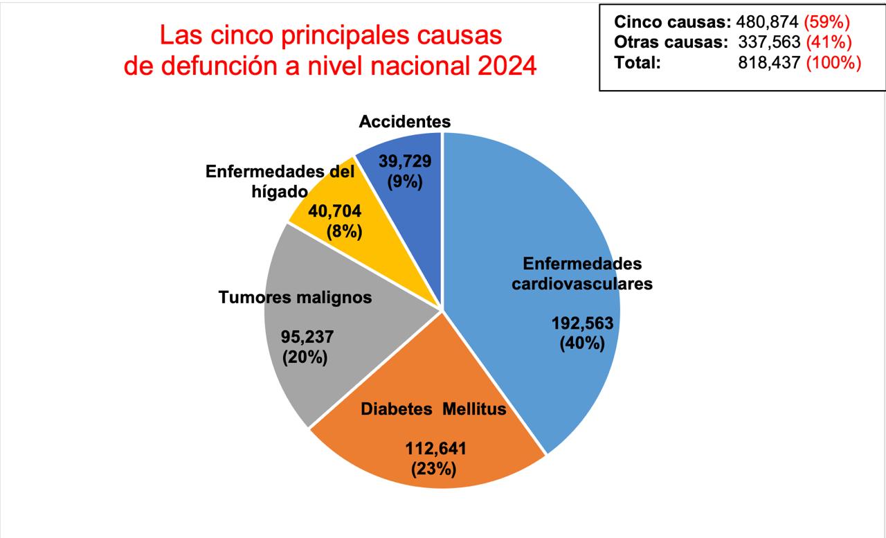 Sin querer ser catastrófico, pero el problema es grave. INEGI (ENIGH, 2024) estima que 7 de cada 10 niños y adolescentes consumen diariamente un refresco, incluso en el desayuno; que 4 de cada 10 niños presentan sobrepeso y obesidad; y que el 76.2% de la población mayor de 20 años también presenta sobrepeso y obesidad. Además, las cinco principales causas de defunción en México en el año 2024 fueron enfermedades cardiovasculares (192,563), diabetes mellitus (112,641), tumores malignos (95,237), enfermedades del hígado (40,704), y accidentes (39,729), las cuales sumadas ascienden a 480,874 personas que representaron el 59% del total de muertes de ese año (ver gráfica). Corregir y prevenir el problema requiere acciones de distinta índole: económicas, culturales, educativas, legales, familiares, entre otras.