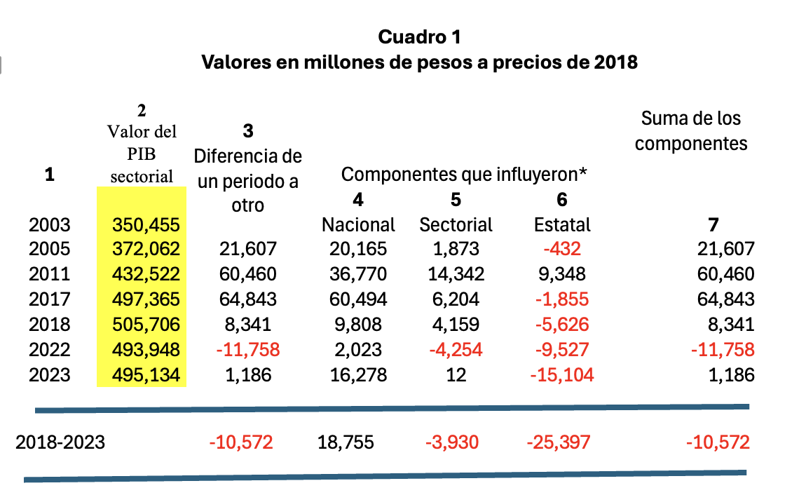 La columna 1, con excepción del 2003, muestra los resultados al final de cada administración de gobierno; la 2, muestra la suma agregada de los valores brutos del PIB para cada uno de los sectores de Sinaloa y representa el 95% del PIB estatal. Omite lo correspondiente a los impuestos sobre los productos netos. La columna 3, muestra las variaciones absolutas de una administración a otra; la 4, nos da los valores que tendría la economía estatal si su dinámica fuera igual a la variación porcentual de la economía nacional; la 5, nos enseña las variaciones que cada sector de Sinaloa tiene en comparación a su variación sectorial nacional; la 6, y la que nos importa a los sinaloenses, muestra si la entidad tiene o no fortalezas competitivas y; la 7, es de comprobación ya que la suma horizontal de los tres componentes (columnas 4, 5 y 6) nos debe dar el mismo valor que la variación estatal (columna 3).
