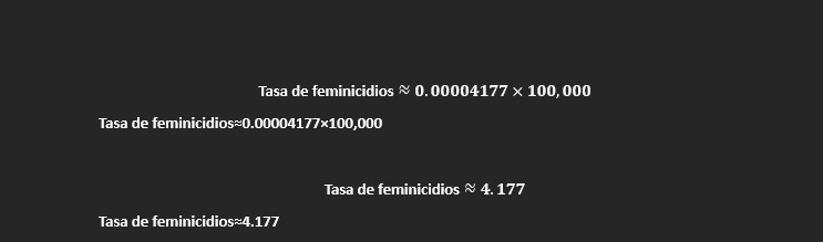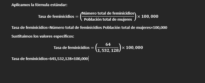 Ahora bien, si realizamos nuestro propio calculo usando los datos de la FGE, la tasa de feminicidios se calcula utilizando una fórmula estandarizada que relaciona el número de víctimas con la población femenina total de un área específica, generalmente expresada por cada 100,000 mujeres, para permitir comparaciones entre diferentes regiones o períodos.
