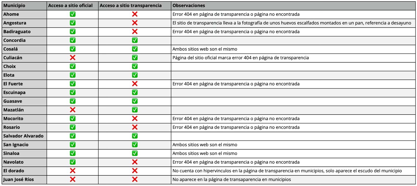 Dando click en los enlaces tanto de los sitios oficiales como de los sitios de transparencia encontré que solo nueve municipios cuentan con ambos hipervinculos que llevan a páginas oficiales y de transparencia vigentes, de estos 9 municipios, 3 llevan a la misma página en su enlace al sitio oficial del municipio y al de transparencia. Mientras el resto de los municipios cuentan con una variación interesante entre enlaces con acceso correcto a páginas tanto oficiales como de transparencia. Encontrando al menos 9 links que no llevan a nada, sitios webs no encontrados, error 404 o el más paradójico de los casos, el link del sitio de transparencia del municipio de Angostura, que lleva a una imagen de unos huevos escalfados a manera de desayuno, como lo puede comprobar usted mismo en este enlace: https://angostura.gob.mx/wp-content/uploads/2024/05/typify-demo06-breakfast-04-1.jpg