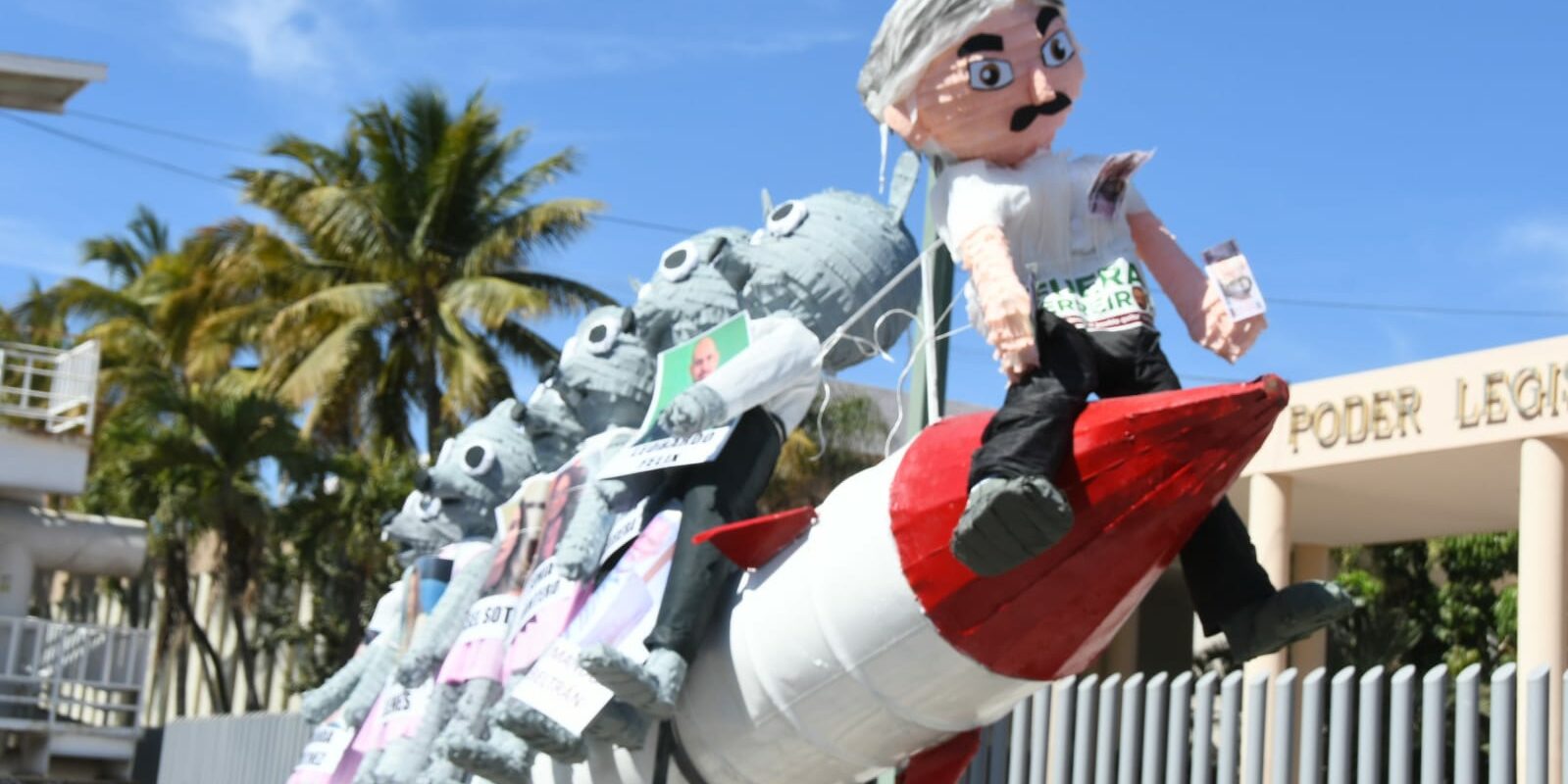 Desde muy temprano, durante la mañana de este lunes, apareció un extraño objeto afuera de las instalaciones del Congreso del Estado. Por sus materiales hacía alusión a un auto alegórico, pero por sus características era evidente que llevaba una carga política; era la representación de un cohete con fotos de funcionarios del Ayuntamiento de Culiacán y en la punta, un muñeco en forma de piñata que personificaba al alcalde Jesús Estrada Ferreiro listo para volar.