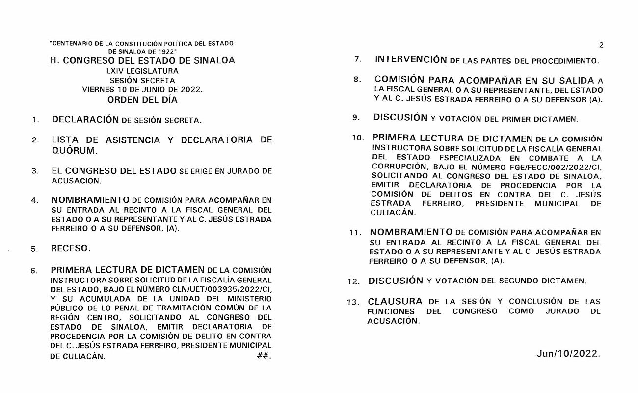 Será este próximo viernes 10 de junio cuando, en sesión secreta, el Congreso del Estado votará si proceden o no las solicitudes de desafuero hechas por la Fiscalía General del Estado en contra del Alcalde con licencia de Culiacán, Jesús Estrada Ferreiro.