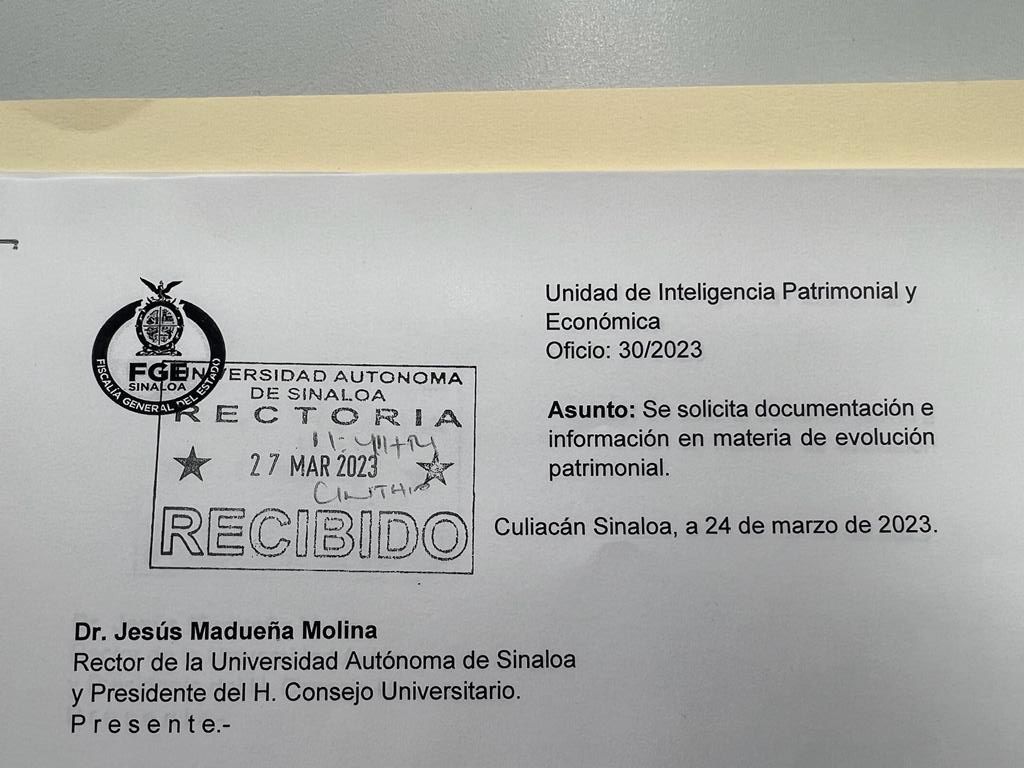 El 27 de marzo llegó un documento y ese día se selló como recibido, en el que se pidió puntualmente la documentación necesaria sobre la evolución patrimonial de Héctor Melesio, Angélica María y Mónica María Cuén Díaz, hijas e hijo de Héctor Melesio Cuén Ojeda, ex rector de la UAS y fundador del Partido Sinaloense (PAS).