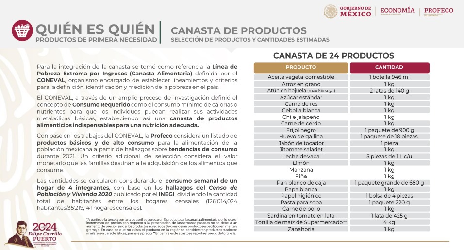 Para la elaboración de la canasta básica, se ha utilizado como referencia el listado de la PROFECO, construido en base a la Línea de Pobreza Extrema definida por el CONEVAL. Este indicador establece los productos esenciales que una familia debe adquirir para cubrir sus necesidades básicas y mantener un nivel de vida mínimo.