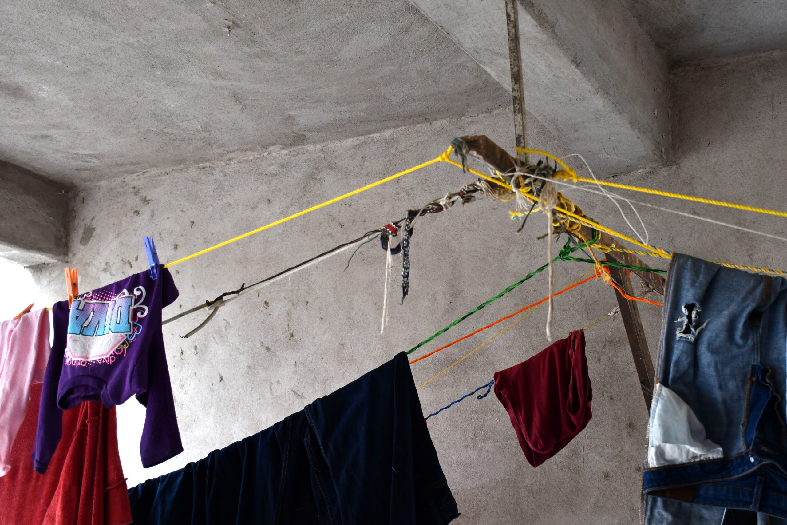 A la entrada de la casa en obra negra habilitada como cuartería se encuentra una suerte de patio central en el que las cuerdas de tendidos van y vienen mientras el poco sol y viento del día secan la ropa de los habitantes de los 16 cuartos o espacios disponibles. Al fondo están los lavaderos, y al costado izquierdo de la edificación, planta baja y primer piso forman hileras de cuartos disponibles para renta a 800 pesos el mes.
