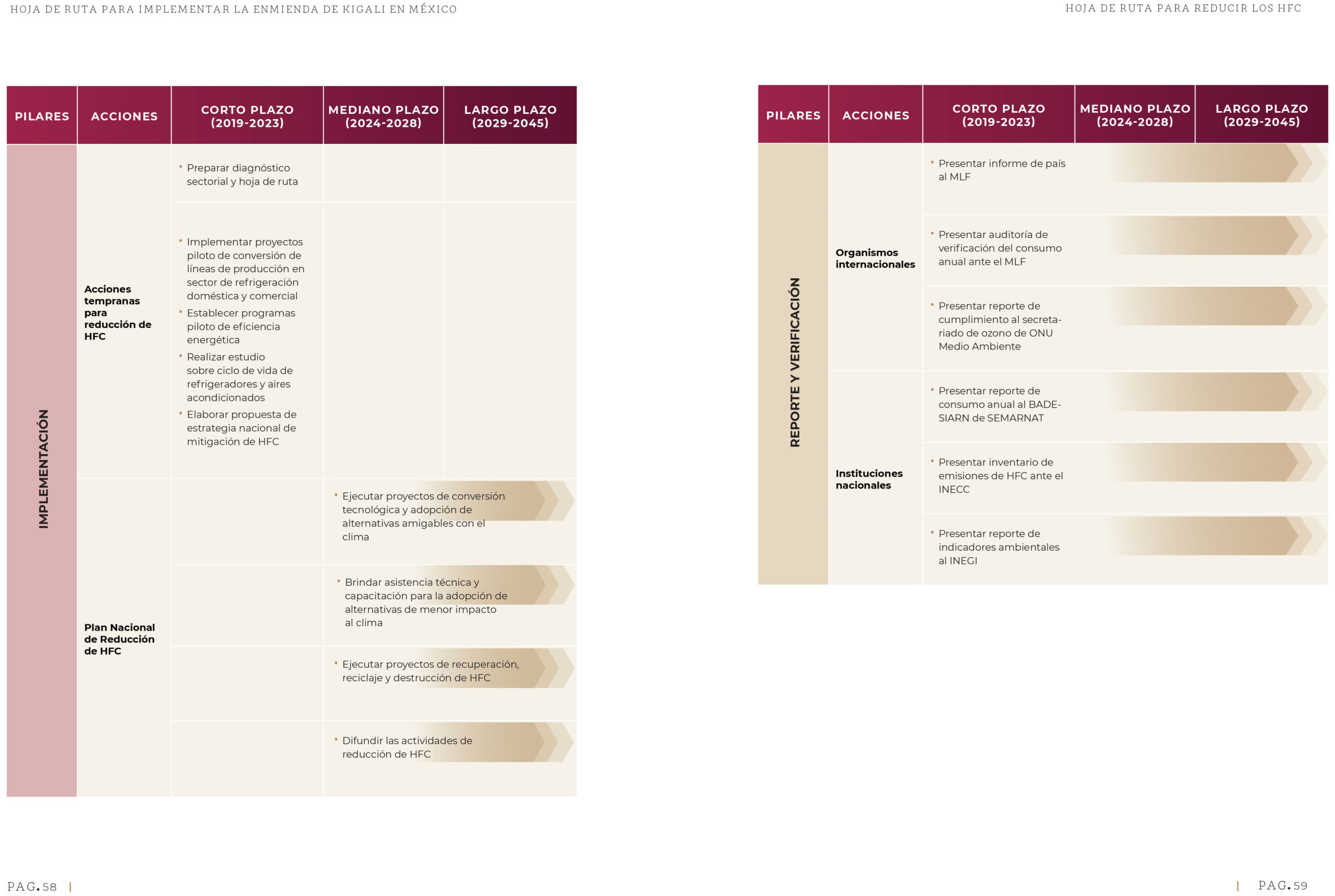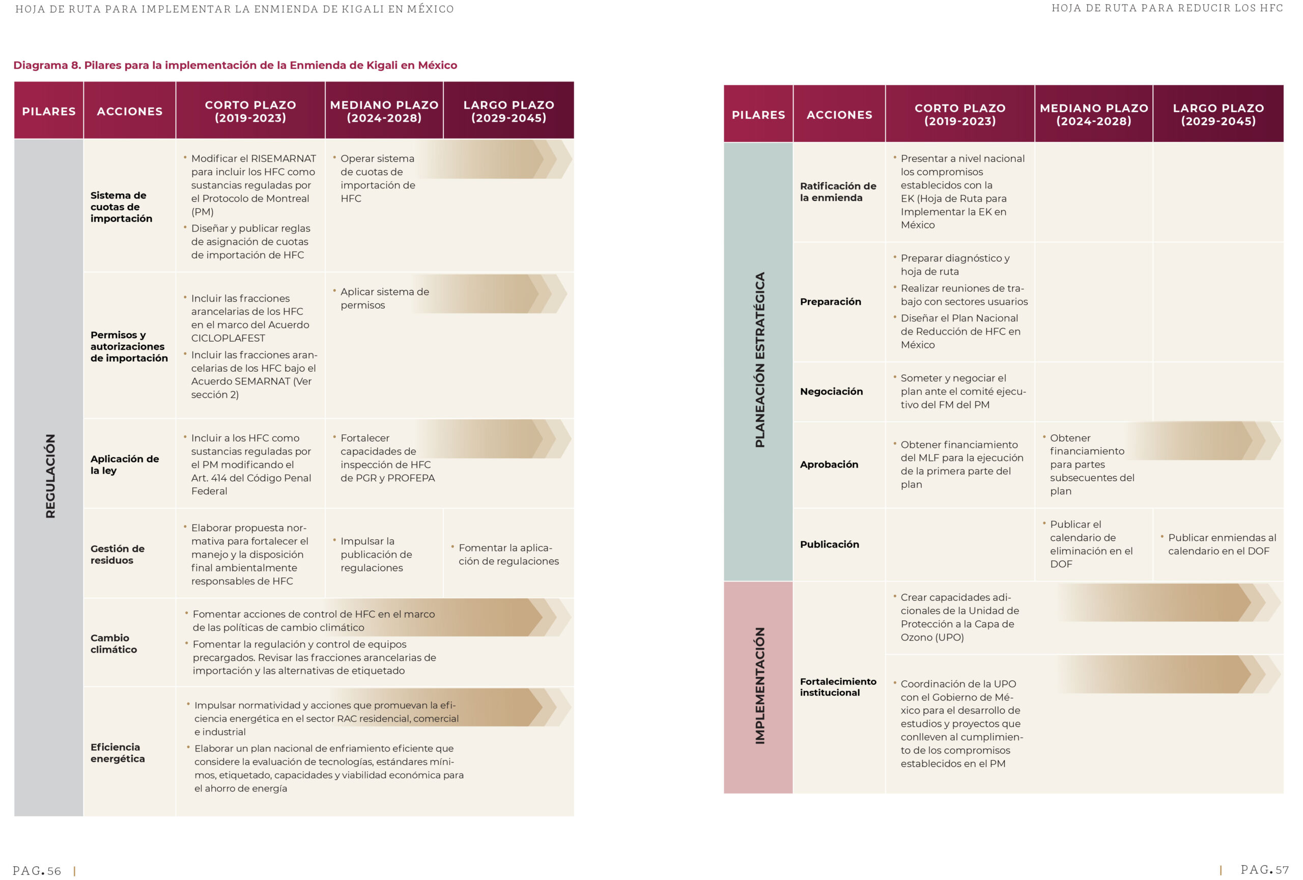 El 29 de mayo del 2019, poco después de la entrada en vigor de la enmienda, el gobierno mexicano publicó una hoja de ruta para su implementación. Está marca tres periodos de intervención (2019-2023, 2024-2028 y 2029-2045) así como estrategias específicas para cada fuente de HFC.