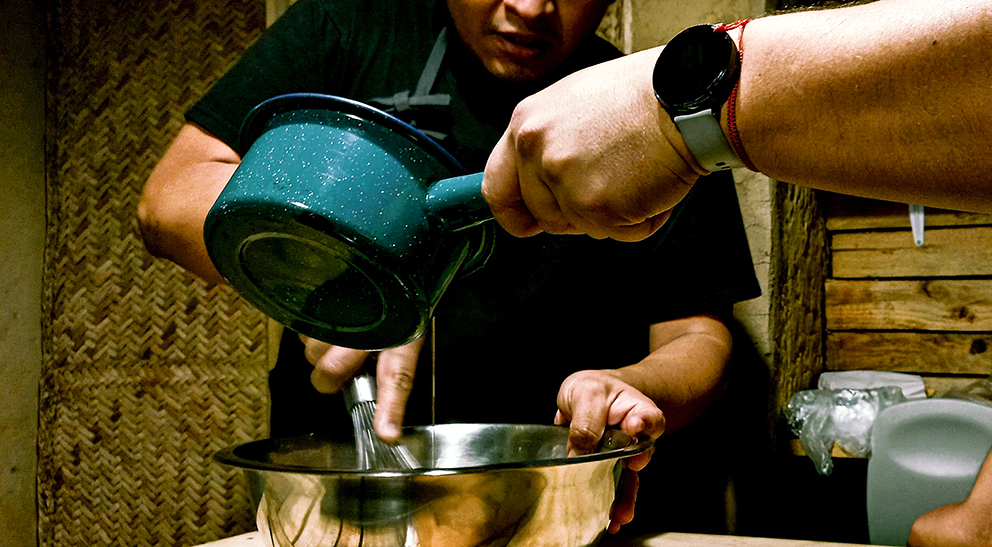 Aunque parece simple, hacer la vinagreta le resulta cansado no solo por la fuerza constante que emplea al incorporar los líquidos durante varios minutos seguidos con el mismo brazo, sino también porque siempre hace más de una cosa al mismo tiempo, todo esto mientras da servicio. Aliviado y con una sonrisa cubriendo su rostro por el resultado obtenido comparte que una de las paradojas de los cocineros es pasar la mayor parte del tiempo cocinando para otras personas y pocas veces o nunca hacerlo para uno mismo.
