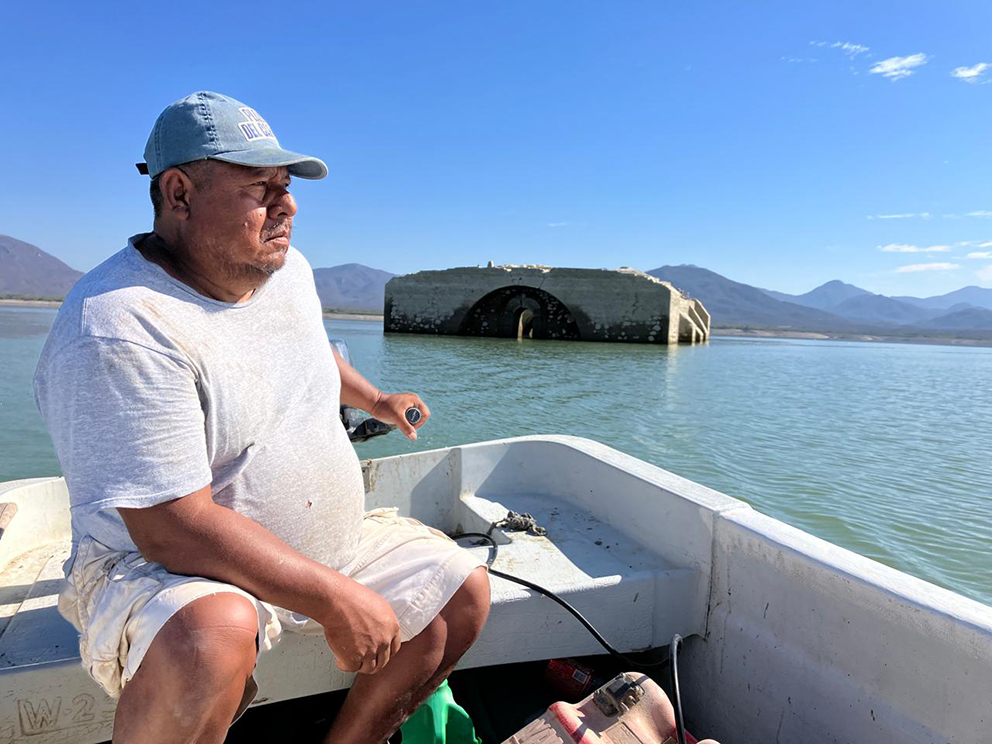 Alejandro Olvera, pescador y lanchero de Jalapa del Marqués explica que, cuando el ex convento del Siglo XVI emerge de la presa “Presidente Benito Juárez”, significa qué hay sequía.