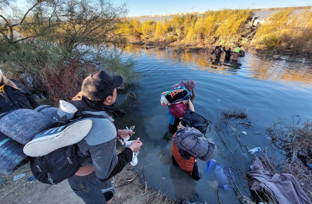 Migrantes que cruzaron el río Bravo esperan frente al muro fronterizo de Estados Unidos con Ciudad Juárez. Fotografía: Rey R. Jauregui / La Verdad