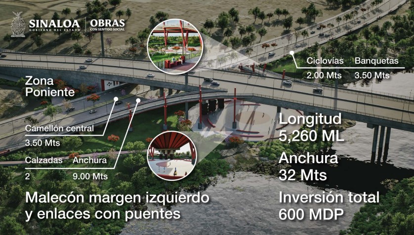 Este será el proyecto vial más costoso del plan con un monto de inversión de 600 millones de pesos, en cual consiste en un malecón por el margen izquierdo del río y enlaces con puentes añ bulevar Pedro Infante para beneficiar a la zona poniente de la ciudad.