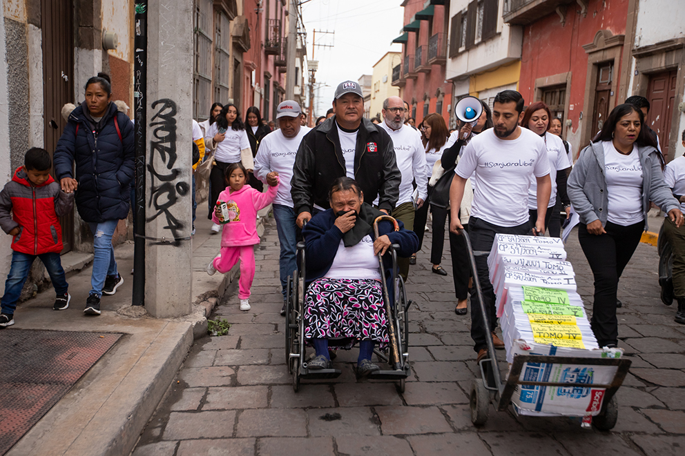 San Luis Potosí. -Al frente del contingente caminaba la familia de Sanjuana Maldonado junto a Jesús Martínez, director de la organización Perteneces. Él, empujaba un diablito, con los tomos de la extensa carpeta de investigación, que apilados miden más de un metro de alto. La escena ocurrió el 15 de febrero, cuando los manifestantes recorrieron unas cuadras del centro de la ciudad de San Luis Potosí hasta llegar al edificio Presidente Juárez, sede del Congreso del Estado. Ahí entregaron la petición de indulto para Sanjuana, que lleva quince años presa, pagando por un crimen que no cometió.