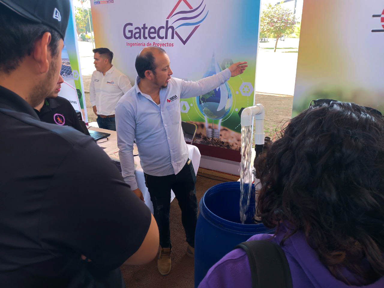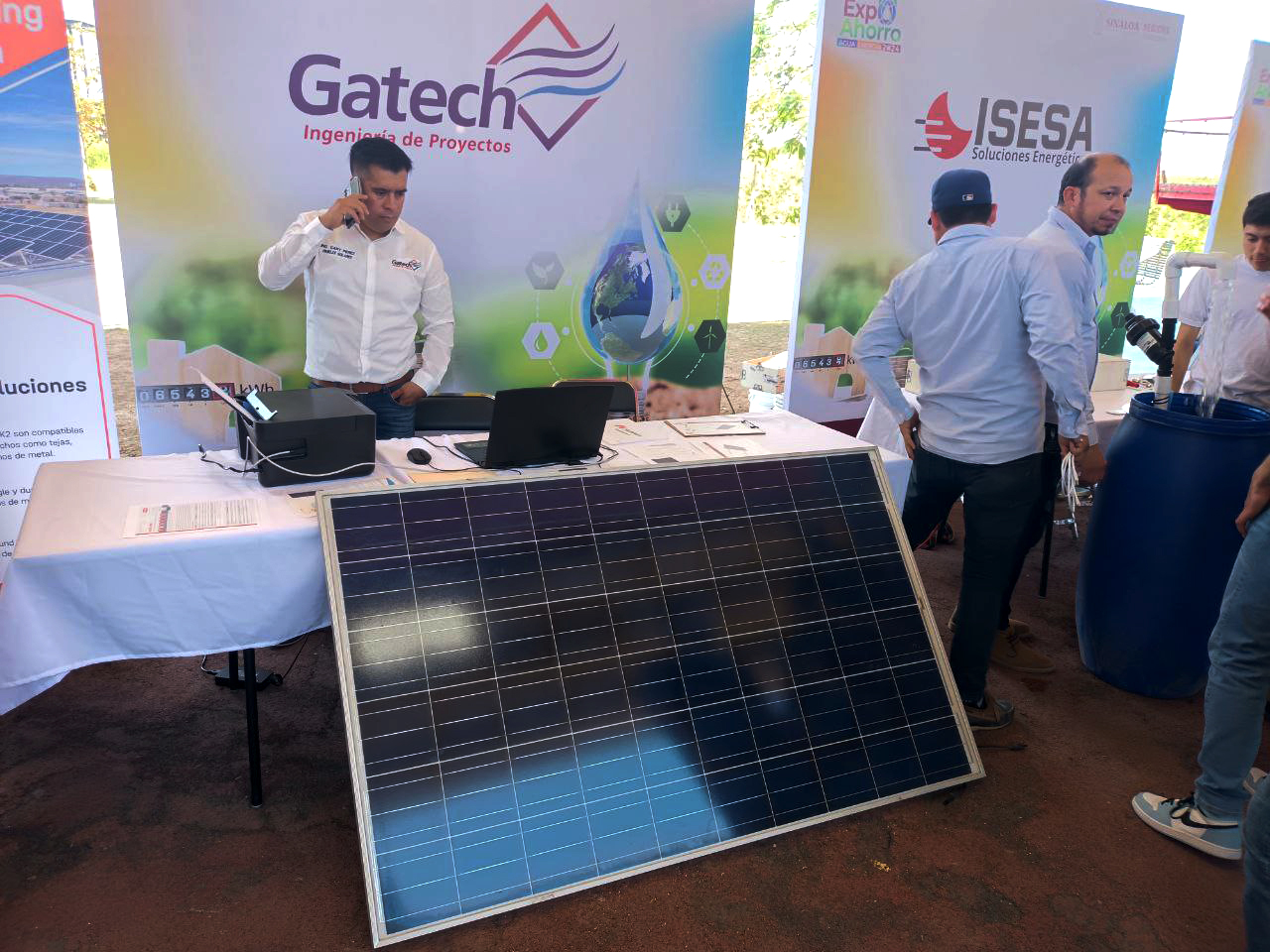 Otra oferta similar fue ISESA Soluciones Energéticas, que mostraba una bomba funcionando mediante paneles solares como una solución para el riego en los campos sinaloenses.