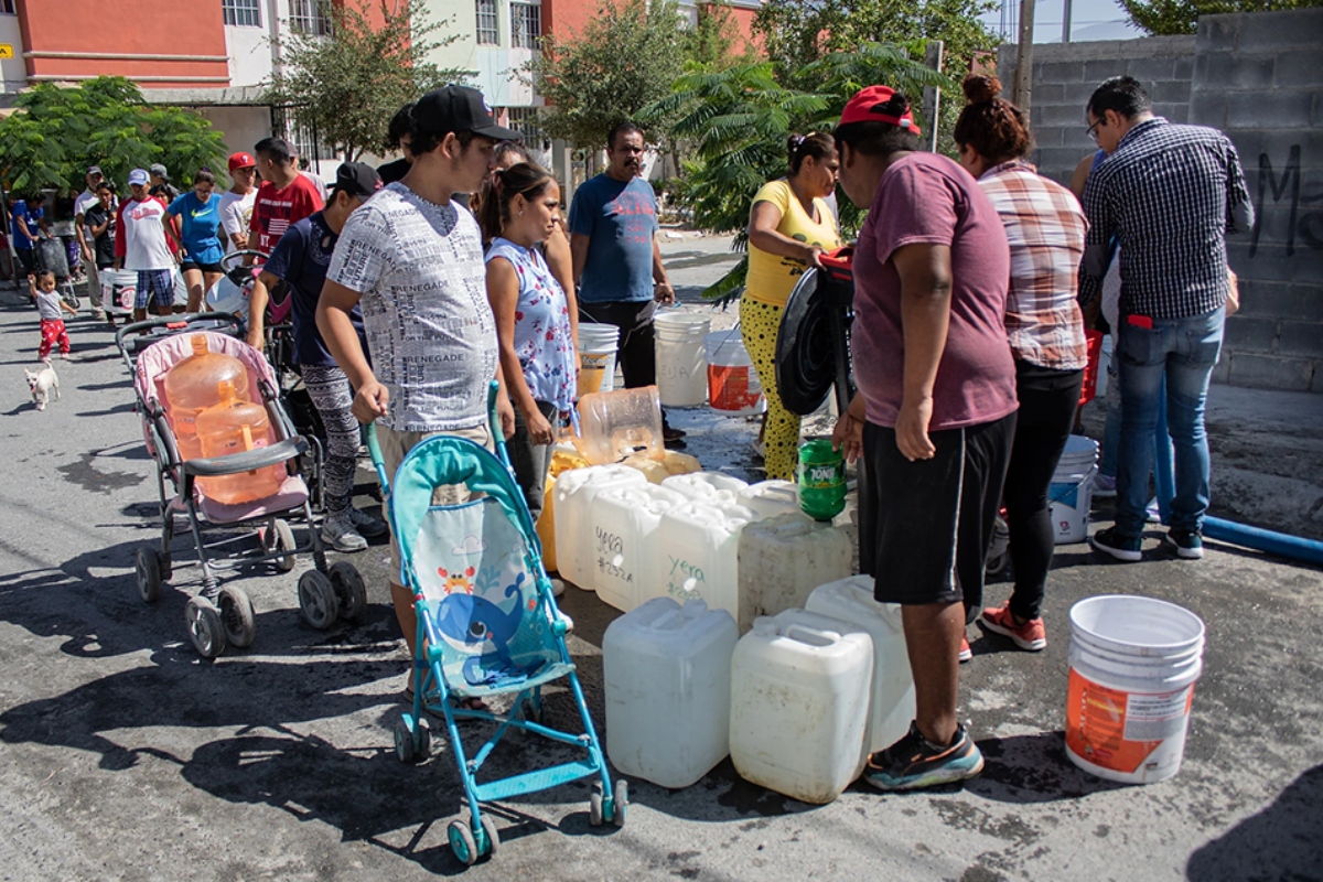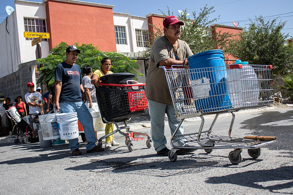 Ese 23 de junio de 2022 la pipa sí pasó. María está despierta desde la cuatro de la madrugada y anoche se acostó a las doce a la espera de que salga un chorro de agua por su llave o llegue una pipa. Son las siete de la mañana cuando el rugido del camión hace salir al trote de sus casas a los vecinos de Villas de Álcali, en el municipio de García, a 40 kilómetros del centro de Monterrey. Familias enteras cargadas de botellones, tambos, baldes, botes y carriolas; carros de la compra y hasta carritos infantiles, van siguiendo la cisterna como al flautista de Hamelin.