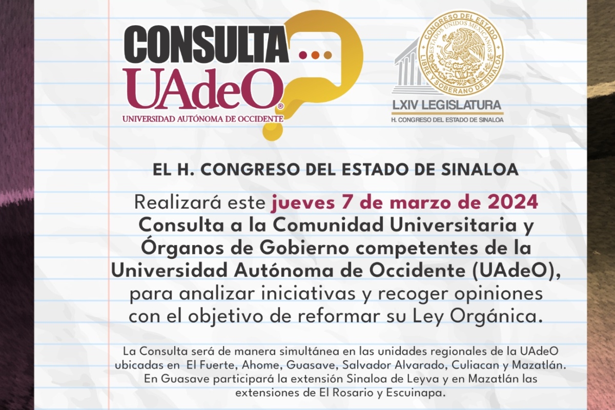 Culiacán, Sinaloa.- El Congreso del Estado de Sinaloa llevará a cabo este jueves 7 de marzo de 2024 una Consulta libre e informada a toda la Comunidad Universitaria de la Universidad Autónoma de Occidente (UAdeO) para recabar propuestas y opiniones sobre la reforma a la Ley Orgánica de esta institución.
