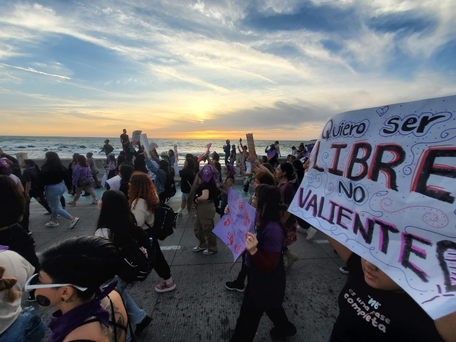 Mazatlán, Sin.- Con megáfono en mano, Anahis Carrizales encabezó la marcha de cerca de 4 mil mujeres que inundaron de morado el Malecón de Mazatlán, con la consigna de exigir justicia e igualdad para las mujeres en el Puerto.