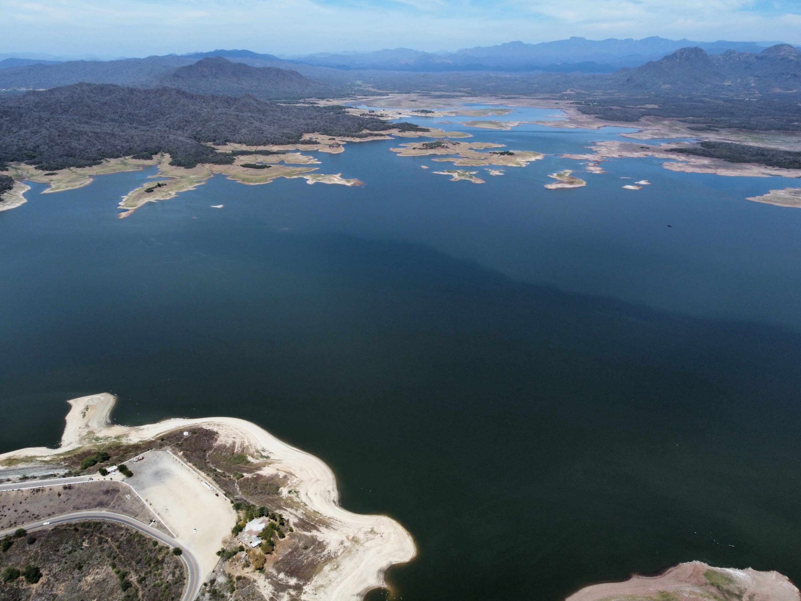 - La Presa Sanalona, en Culiacán, reporta tener un almacenamiento del 25 por ciento de su capacidad. Éste embalse nutre de agua a la Capital del Estado, uno de los municipios más secos en Sinaloa. Fotografía: Marcos Vizcarra.