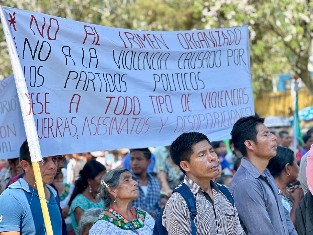 “No al crimen organizado. No a la violencia causada por los partidos políticos. Cese a todo tipo de violencia, guerras, asesinatos y desapariciones”, estaba escrito en una de las pancartas que llevaban alzada pobladores del Gobierno Comunitario del municipio de Chilón.