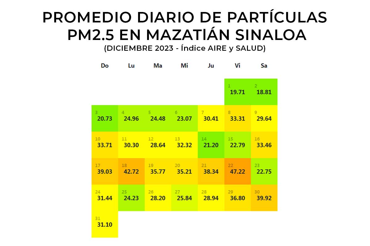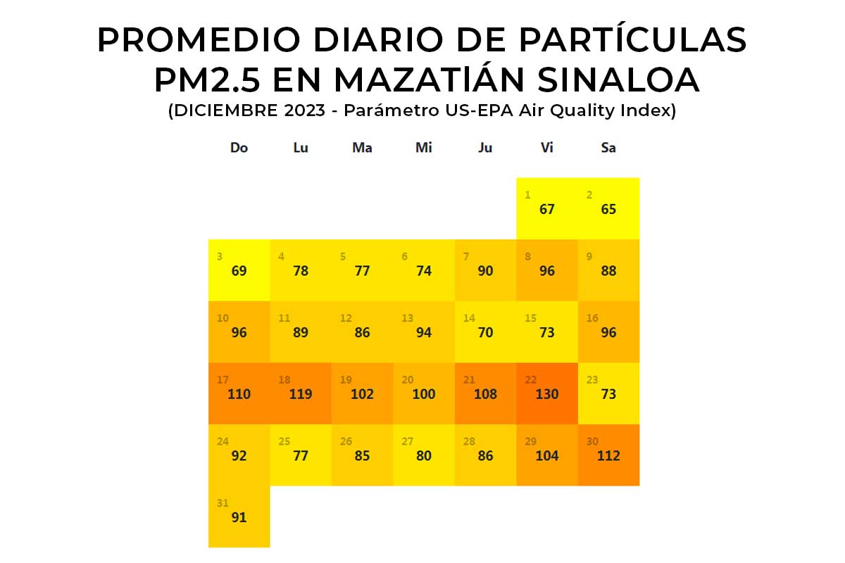 Ya sea con el índice nacional de AIRE y SALUD, con el índice AQI de Estados Unidos o con la más estricta directriz de la OMS 2005, desde diciembre del 2023 la ciudad de Mazatlán ha mostrado múltiples días con mala calidad del aire.