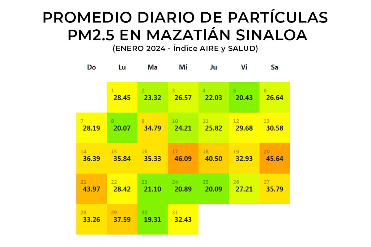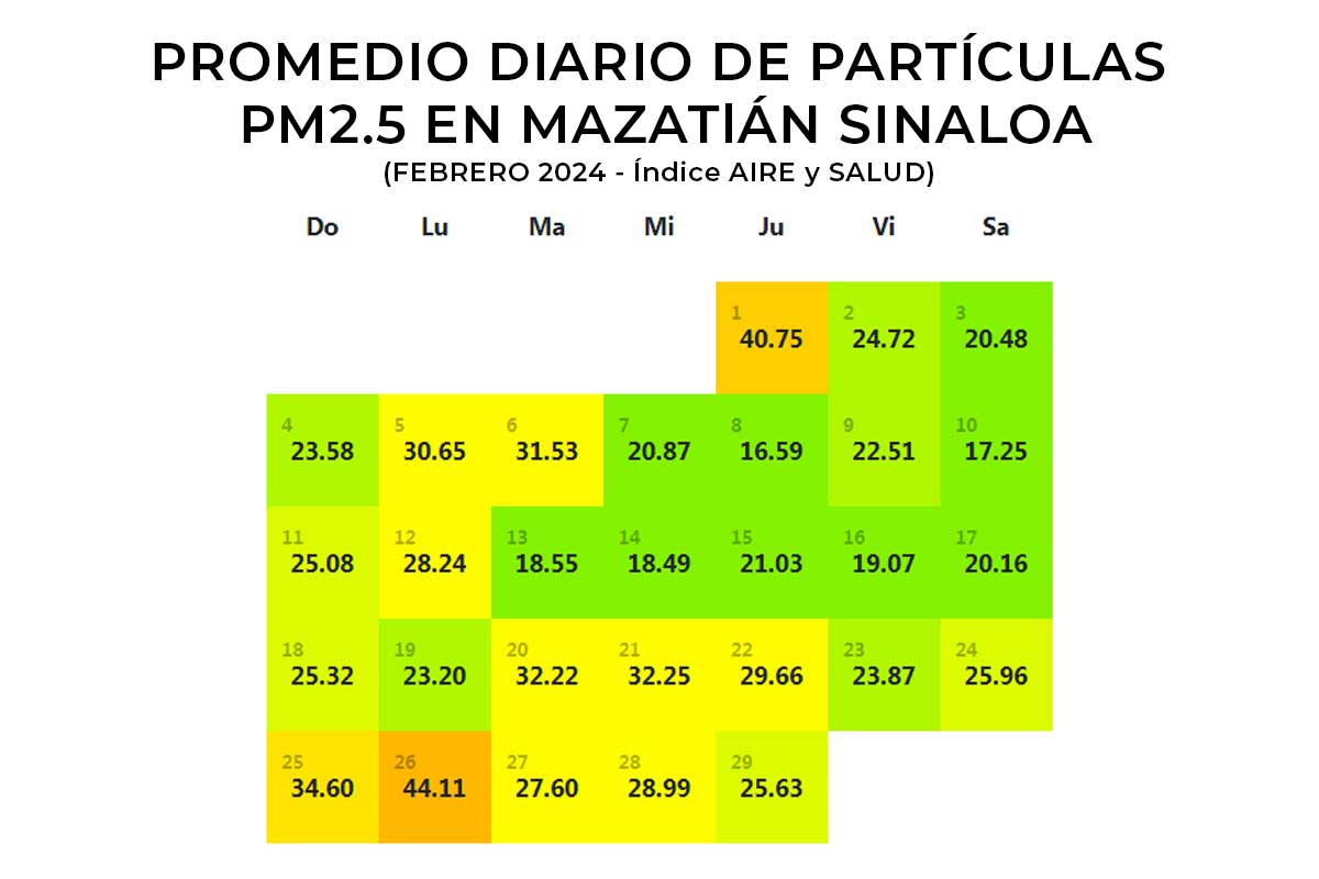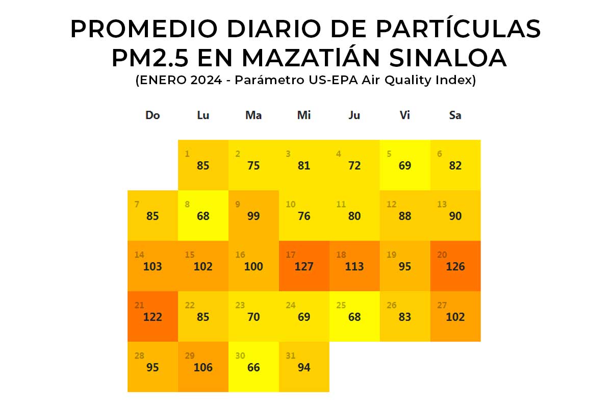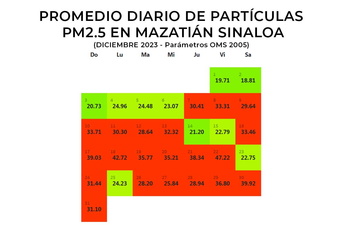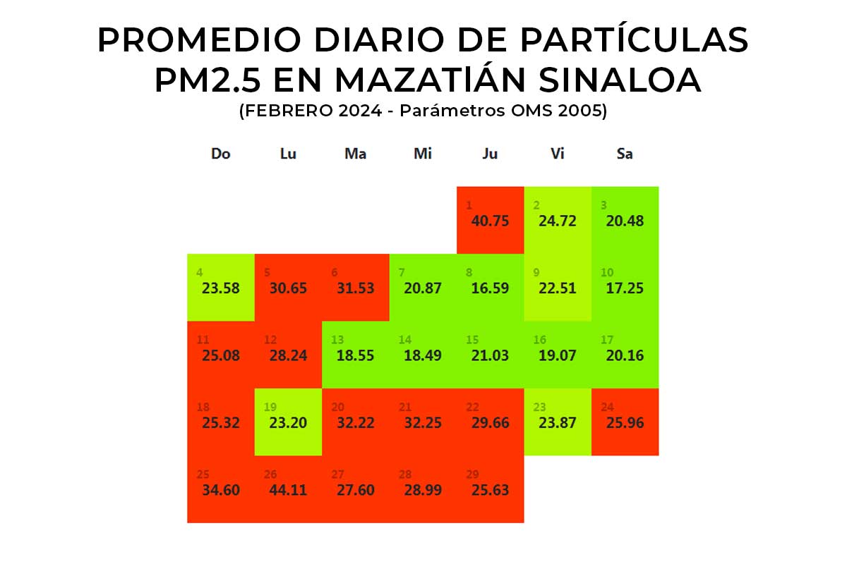 El mapa geo visualizador de la calidad del aire de Redspira, el cual cuenta con un sensor de monitoreo de partículas PM10 y PM2.5 en Mazatlán, muestra cómo desde diciembre del 2023 el puerto turístico ha tenido 58 días en el que los niveles de partículas finas PM2.5 se encuentran por arriba de la norma de la directriz de la OMS 2005 sobre contaminación del aire; en el caso de las partículas respirables PM10 han sido 5 los días en que su cantidad está por encima de la norma en el puerto.