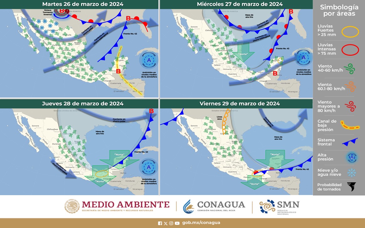 El miércoles, la Octava tormenta invernal se desplazará sobre el sureste de Estados Unidos, dejando de afectar al territorio mexicano.