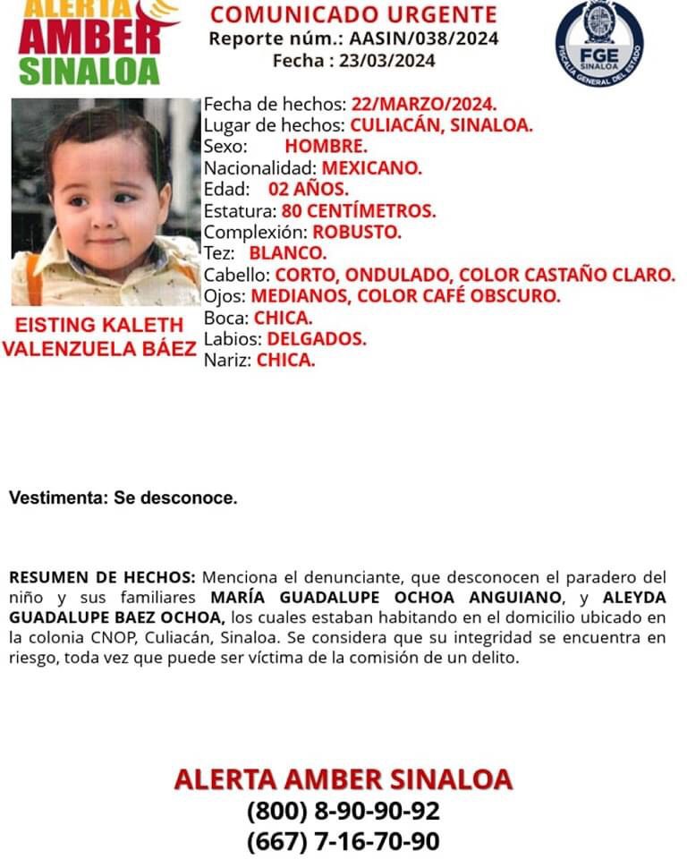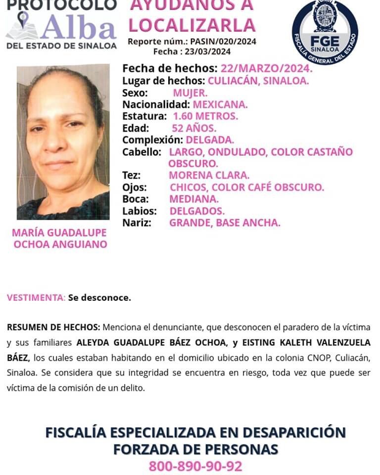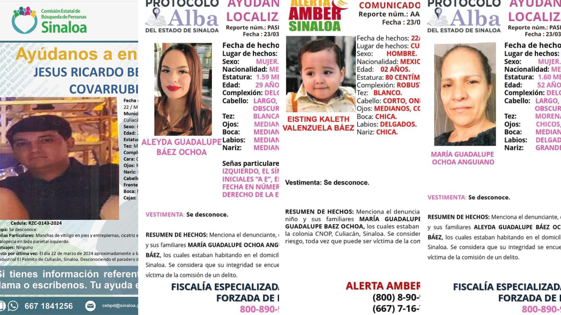 La realidad dista de ese dicho. No solo se trata del caso de Jesús Ricardo, también los familiares de la señora María Guadalupe Ochoa Anguiano, la joven Aleyda Guadalupe Báez Ochoa y el niño Eisting Kaleth Valenzuela Báez siguen sin ser localizados. Fueron desaparecidos el 22 de marzo en la colonia CNOP.