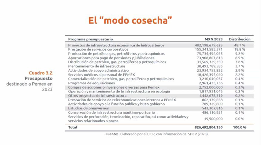 Ante está situación, el activista recordó cómo la Agencia Internacional de Energía hizo un llamado a parar toda nueva inversión en combustibles fósiles, lo que en el caso de Pemex supondría el llevarlo hacia un esquema de “modo cosecha”, en el que se lograría ahorrar casi 50% del presupuesto que la paraestatal tuvo en el 2023 por conceptos de nuevos proyectos de infraestructura.