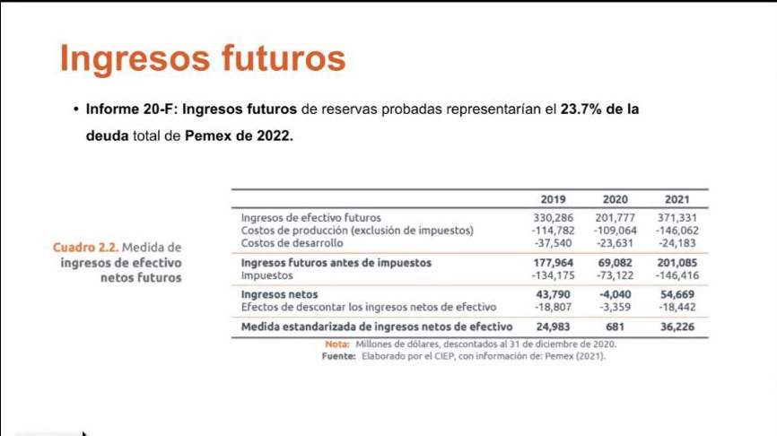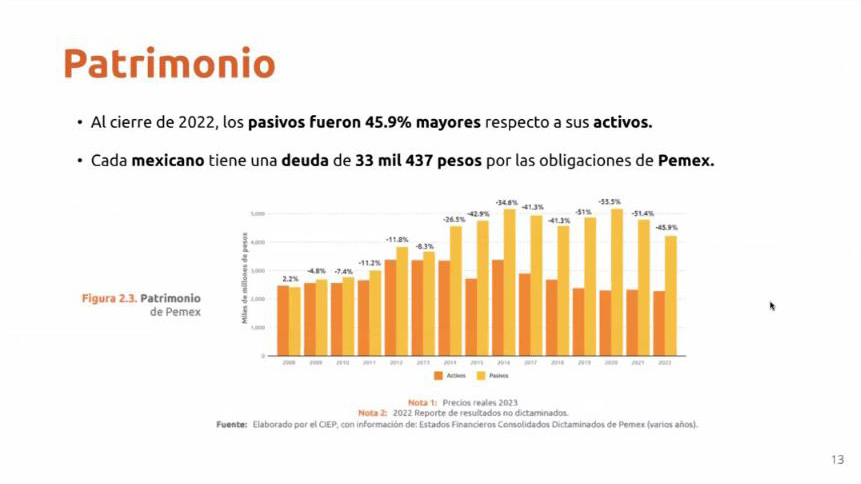 Por último, Kühne advirtió que los pronósticos realizados por el Centro de Información Económica y Presupuestaria (CIEP) pronostican que este 2024 Pemex podría tener su primer saldo negativo de aportes a la federación de 2 mil 74 millones de pesos, y que, al cierre del 2022, los pasivos de Pemex fueron 45.9% mayores a sus activos, deuda que de dividirse entre todos los mexicanos daría 33 mil 437 pesos por persona.