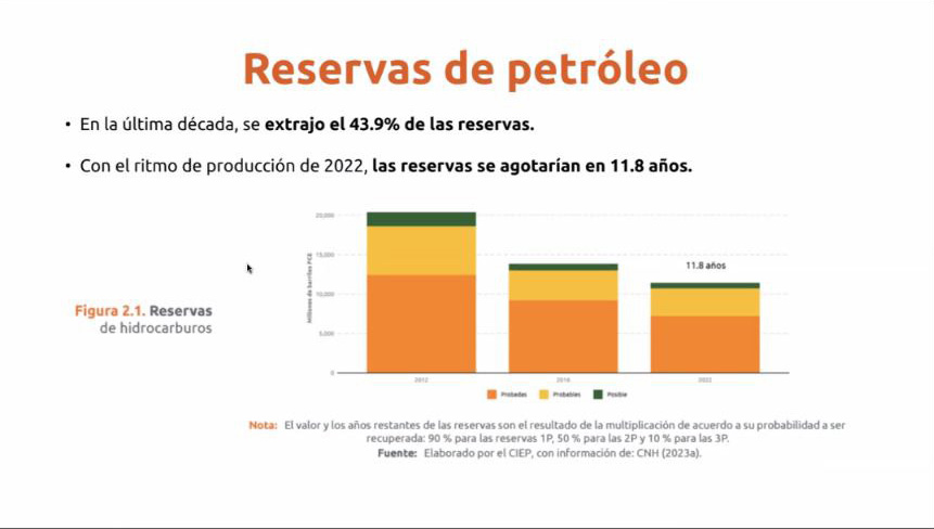 La razón de esto es la disminución de las reservas probadas, donde México se encuentra en el sitio 20 a nivel planetario. Con estas cifras, Ferrari estima que actualmente hemos consumido el 88% del petróleo que puede extraerse con seguridad.