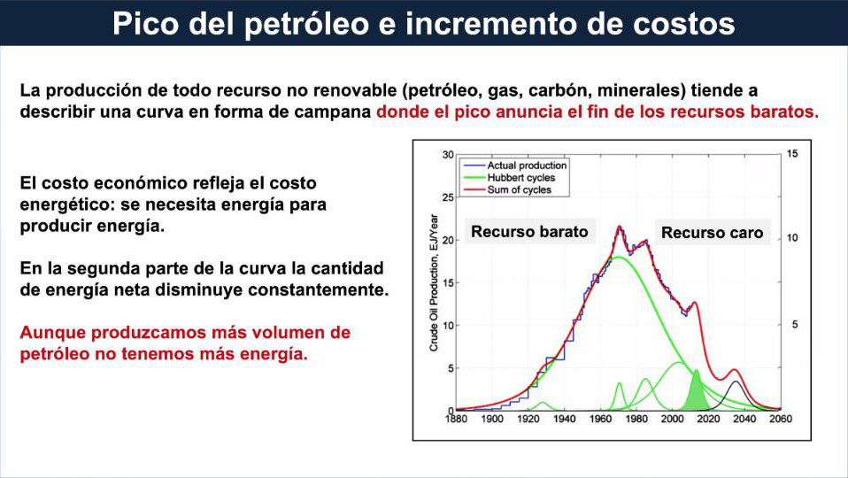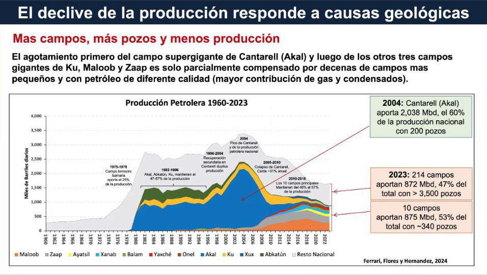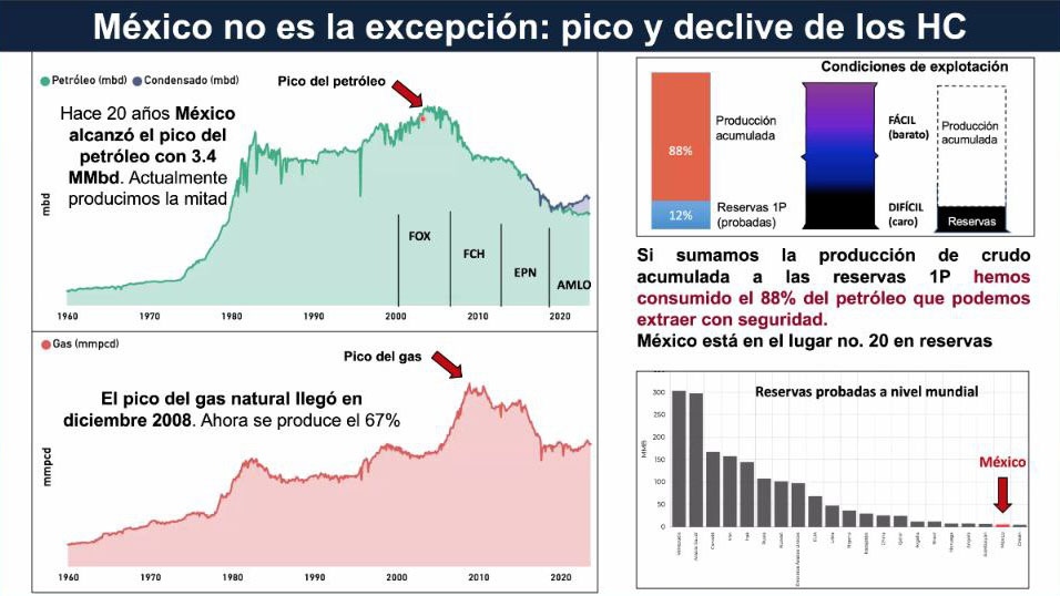 Durante su participación, el investigador del Instituto de Geociencias de la UNAM mostró cómo desde hace alrededor de 20 años México alcanzó el pico de producción petrolera que fue de 3.4 millones de barriles diarios. En el caso del gas fósil, este pico ocurrió en el 2008. Actualmente México produce la mitad de petróleo del que se producía en el 2004 y un 67% del gas fósil que se producía en el 2008.