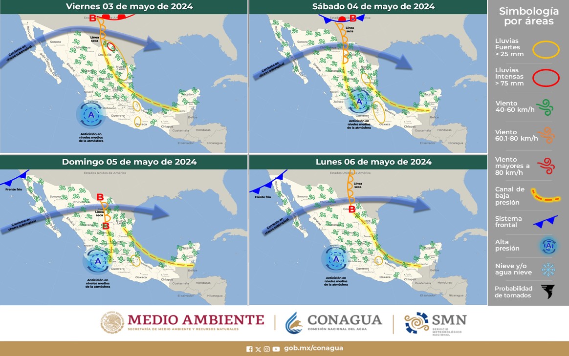 “Por otra parte, la interacción entre una línea seca sobre Coahuila y el flujo de la corriente en chorro subtropical, producirán rachas de viento de 60 a 80 km/h y tolvaneras en el noreste de México, lluvias puntuales intensas en zonas de Coahuila y lluvias puntuales muy fuertes en Nuevo León y Tamaulipas, todas con descargas eléctricas, posible caída de granizo y que podrían originar encharcamientos, deslaves, inundaciones y elevar los niveles de ríos y arroyos”.