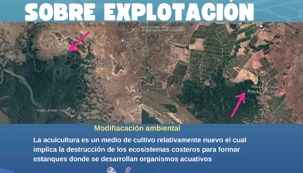 Como ejemplo de esta situación, el biólogo compartió imágenes satelitales de Playa Colorada, en Angostura, las cuales muestran la afectación a la bahía tras los años del boom acuícola, el cual ubicó a principios de los años 2000. “La acuacultura se va adentrando, el llano se hizo mucho más grande y ahora está generando está destrucción de manglares”, lamentó.