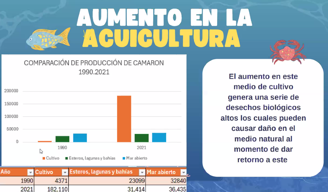 Entre 1990 y 2021, la producción de camarón en granjas acuícolas pasó de 4 mil 371 toneladas a 182 mil 110 toneladas,superando por mucho a lo obtenido mediante la pesca en mar abierto y esteros y bahías.