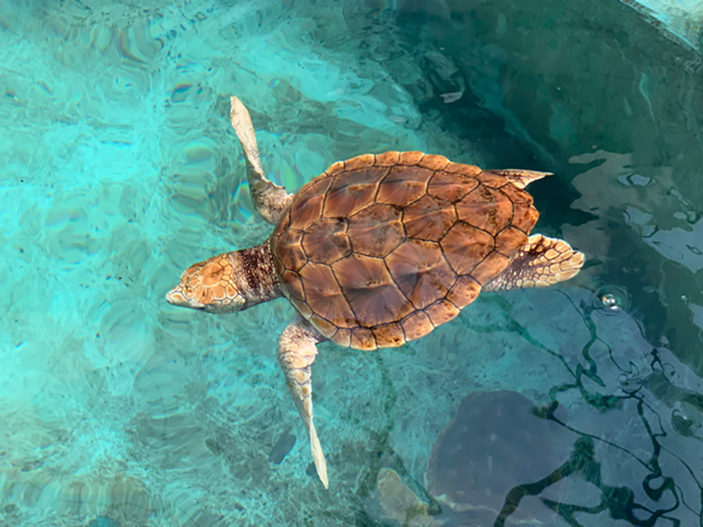 Una cría de tortuga caguama (Caretta caretta) nada en el Acuario Público del Puerto de Nagoya. Foto: Dana Briscoe / Port of Nagoya Public Aquarium