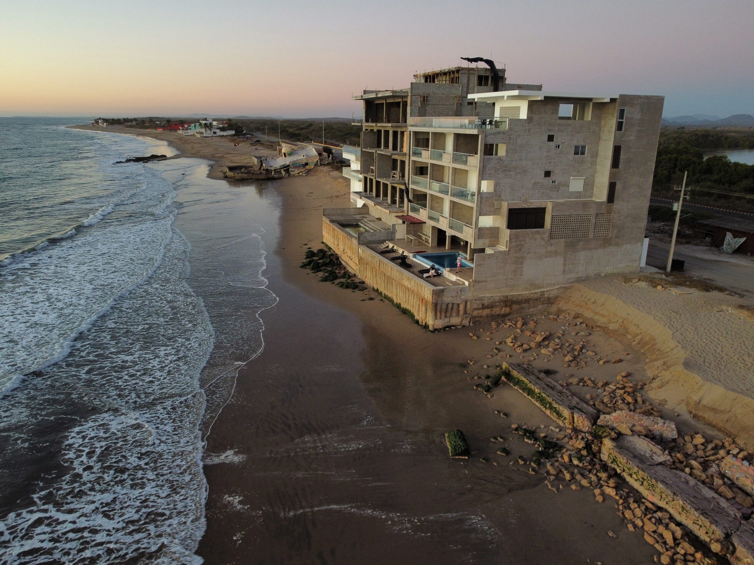 Recientemente, ESPEJO documentó como del 2016 al 2023, Mazatlán otorgó 935 permisos de construcción para edificios de departamentos; un 70 por ciento ubicados frente a la playa. Muchos de estos se iniciaron con permisos irregulares o incluso sin haber sido aprobados por el Ayuntamiento. Algunos, como en la zona de La Escopama, ya tienen muros de contención que, en última instancia, terminarán también contribuyendo a que el mar siga ganando terreno a la playa.